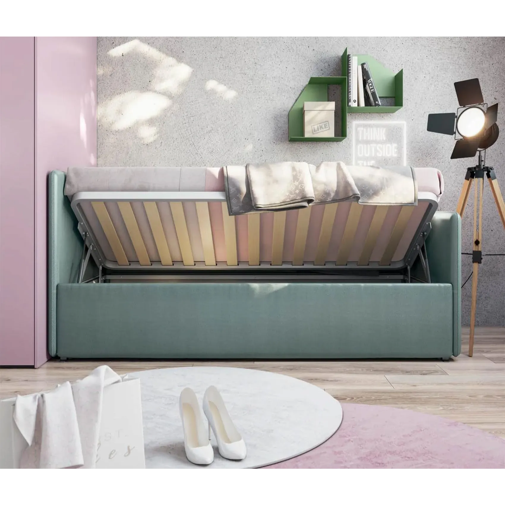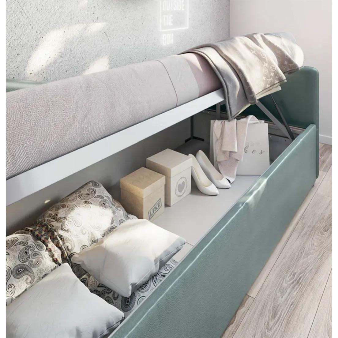 Il grande vano contenitore recupera spazio sotto il materasso e libera posto nell’armadio. La rete si solleva in modo semplice e funzionale.