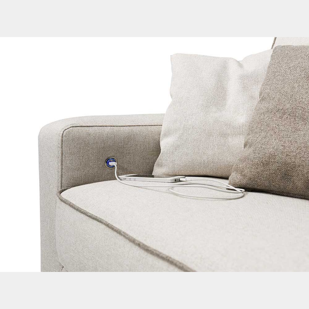 Divano Tor a 2 posti con presa USB integrata, tessuto Burro con bordino Grigio Chiaro