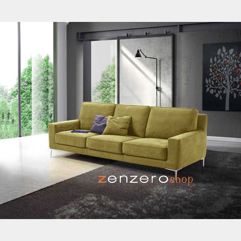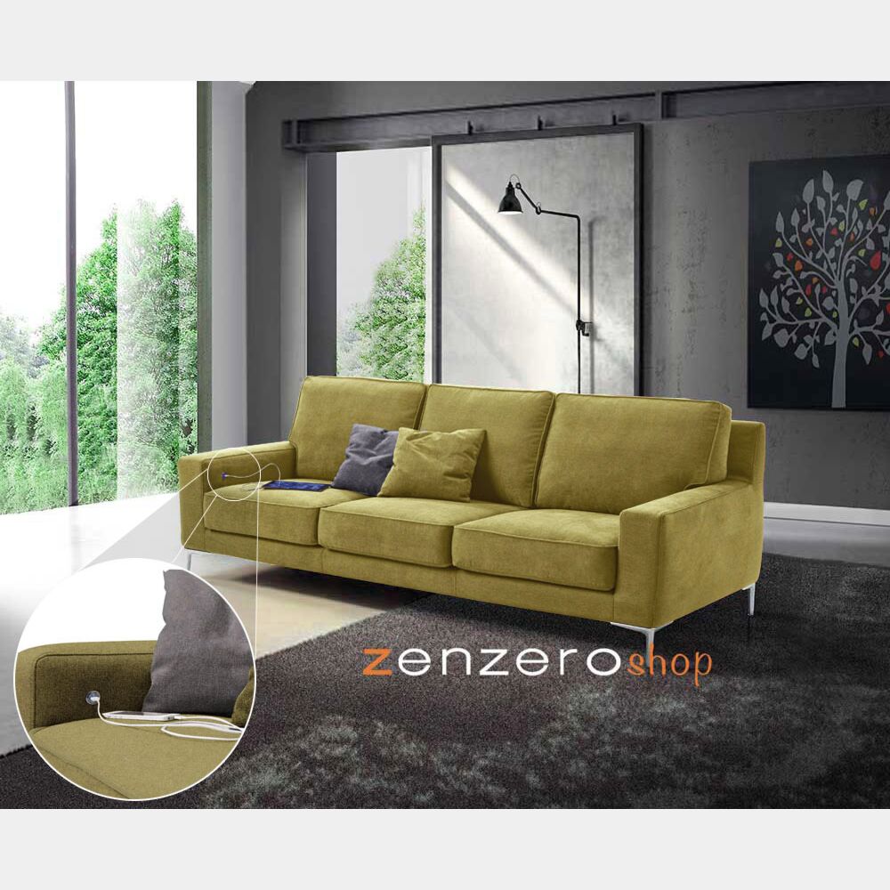 Il Divano Tor in tessuto Verde salvia con bordino in tinta fa parte della collezione Ginevra. L'arredo adatto per il tuo soggiono moderno è composto da 3 sedute e una struttura in legno di abete e truciolare con imbottitura in poliuretano, rivestita in tessuto protettivo accoppiato. Il molleggio è realizzato con nastri elastici. I cuscini delle sedute sono in poliuretano espanso con fibra acrilica, indeformabili con densità 25, mentre i cuscini degli schienali sono in fiocchi di fibra. Il divano ha una presa USB di serie posizionata sul fianco interno del bracciolo sinistro (a richiesta si può realizzare senza) in modo da poter ricaricare i propri device comodamente. Le gambe del divano Made in Italy sono in metallo cromato con altezza 15 cm.