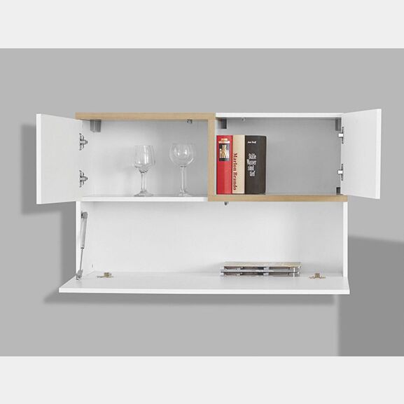 Il pensile è formato da una ribalta dotata di pistone per rallentare l'apertura e da 2 ante. Questa suddivisione dello spazio utile consente di posizionare molti oggetti.
