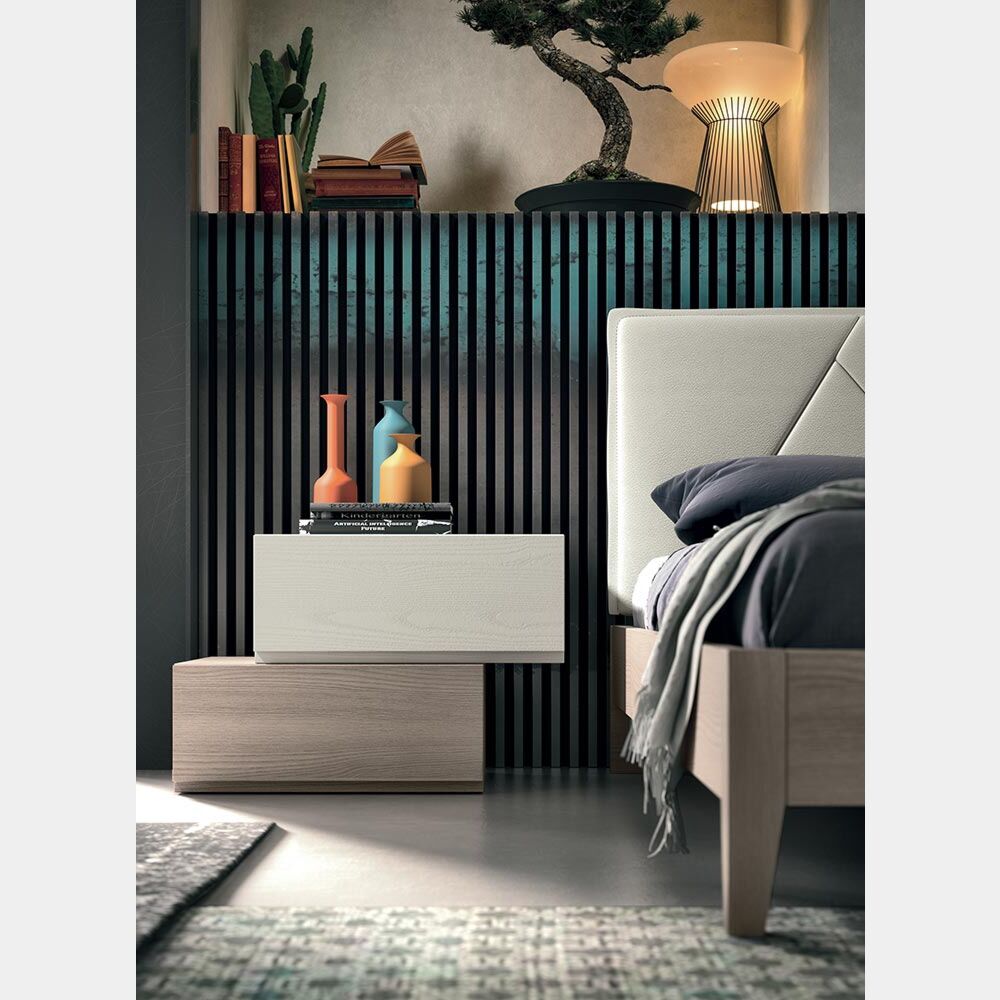 Il comodino fa parte dell'esclusiva Collezione Cosmo che gioca con le proporzioni utilizzando questo "gioco" di cassetti svasati molto di tendenza. Consigliamo l'utilizzo di pavimentazioni e tinte neutre, perfette per una combinazione fine ed elegante. Metteranno in risalto la finitura del mobile, senza appesantire l'ambiente, per un risultato davvero sorprendente!