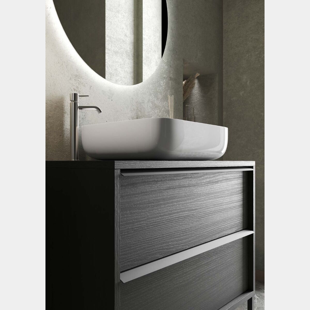 Il mobile da bagno presenta due capienti cassetti con maniglie in tinta, la finitura Nero frassinato dona al bagno carattere ed eleganza. Il lavabo in appoggio in ceramica è incluso.