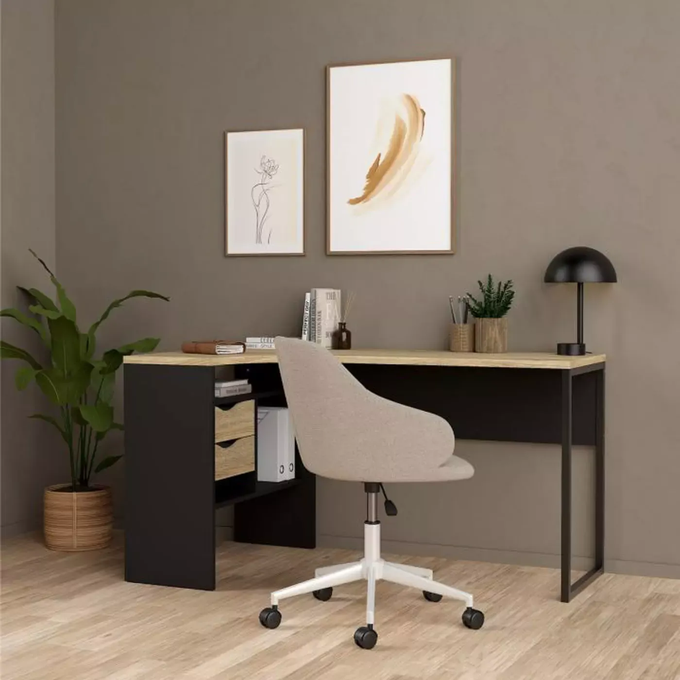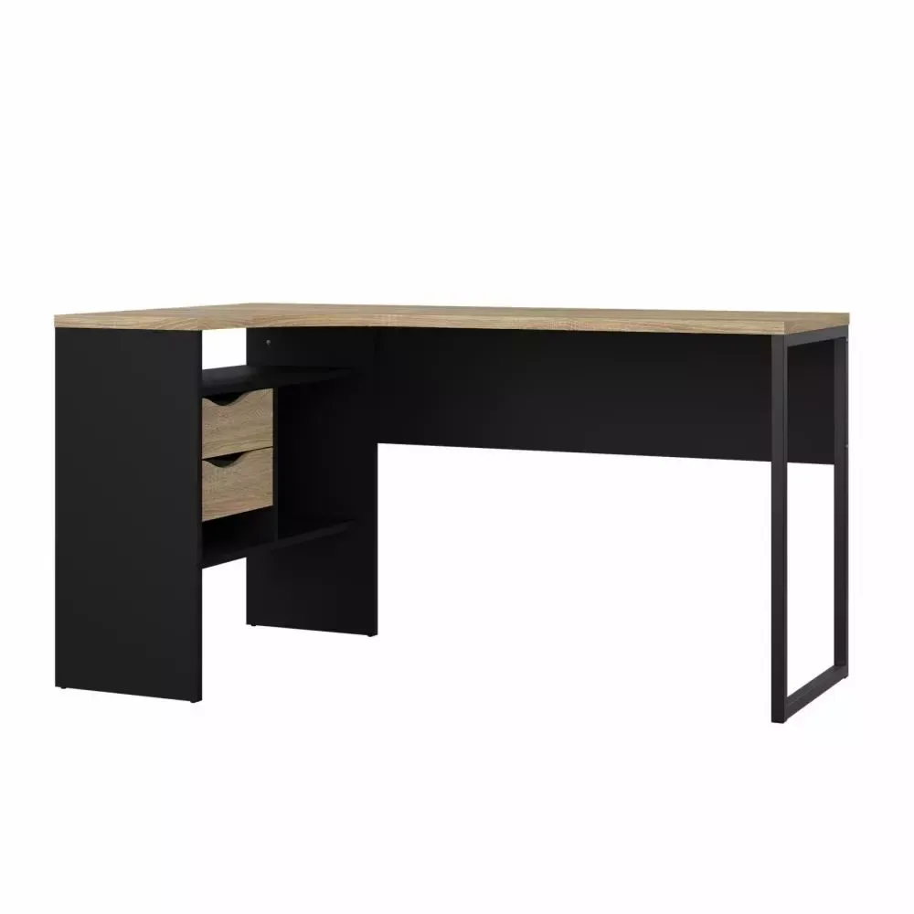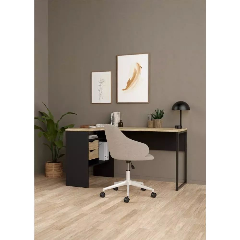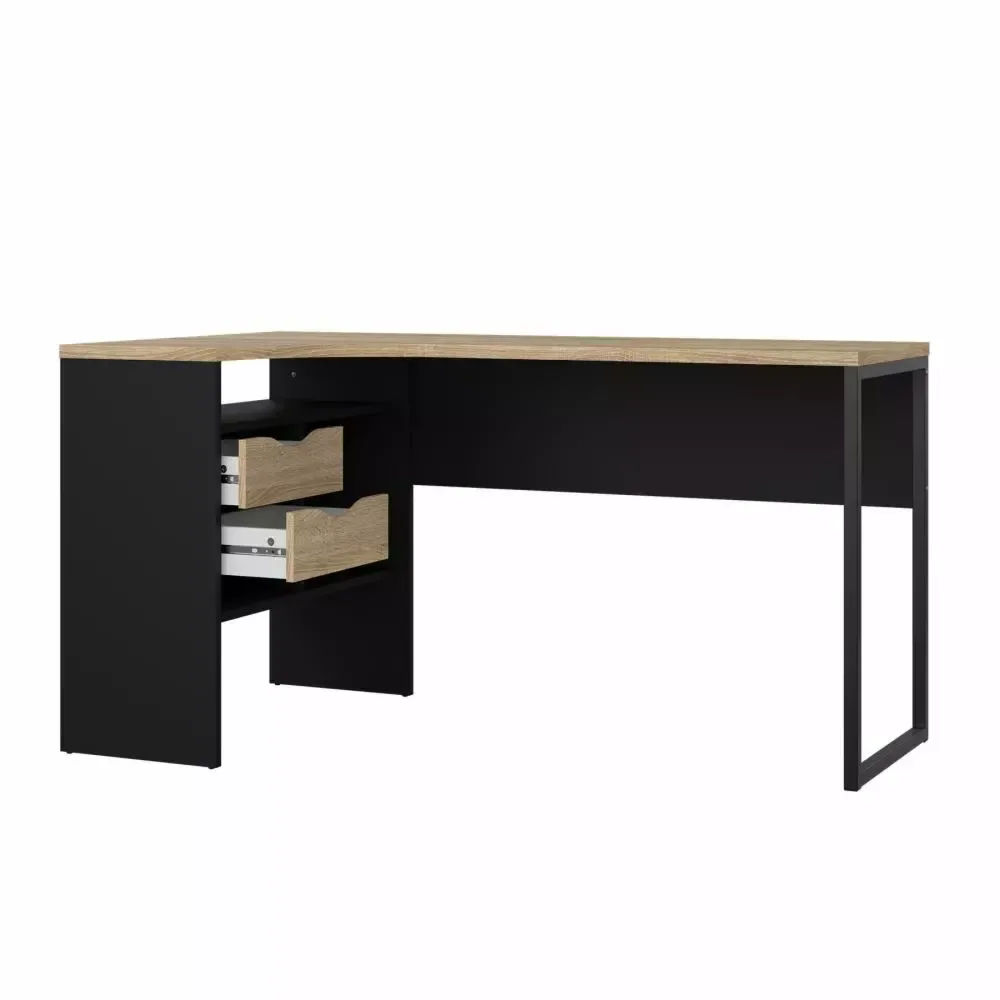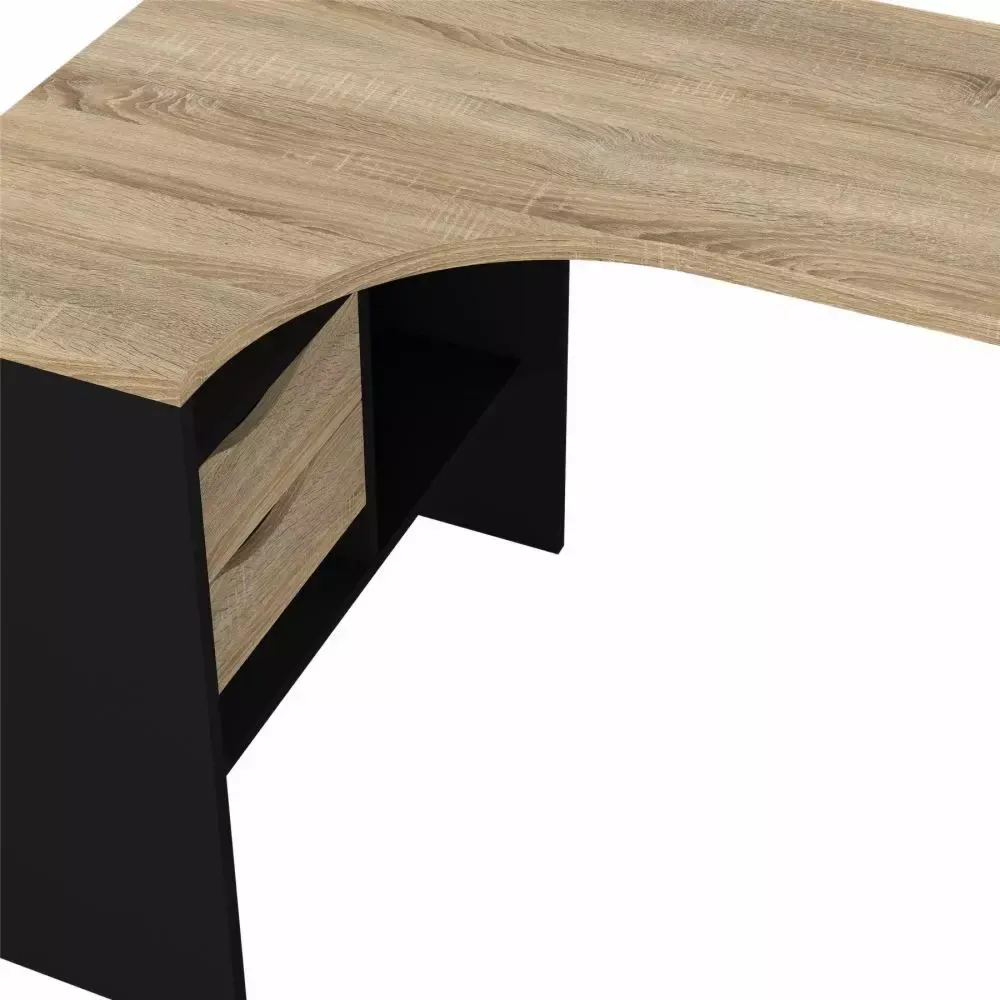 Elegante scrivania angolare con due cassetti colore nero opaco e quercia