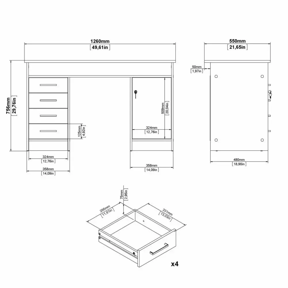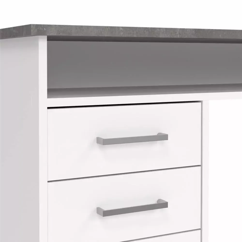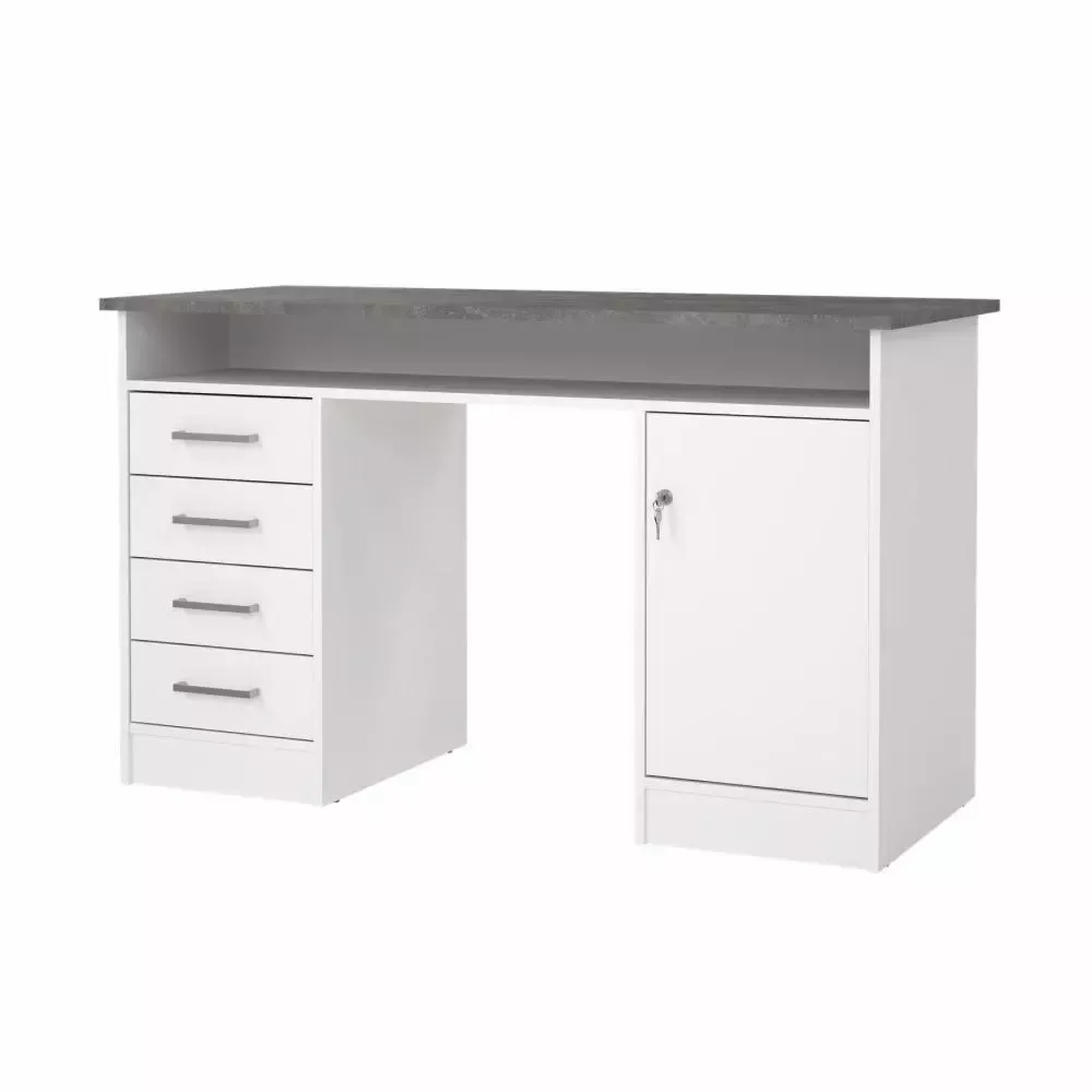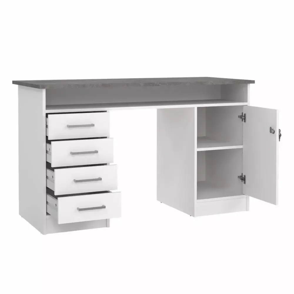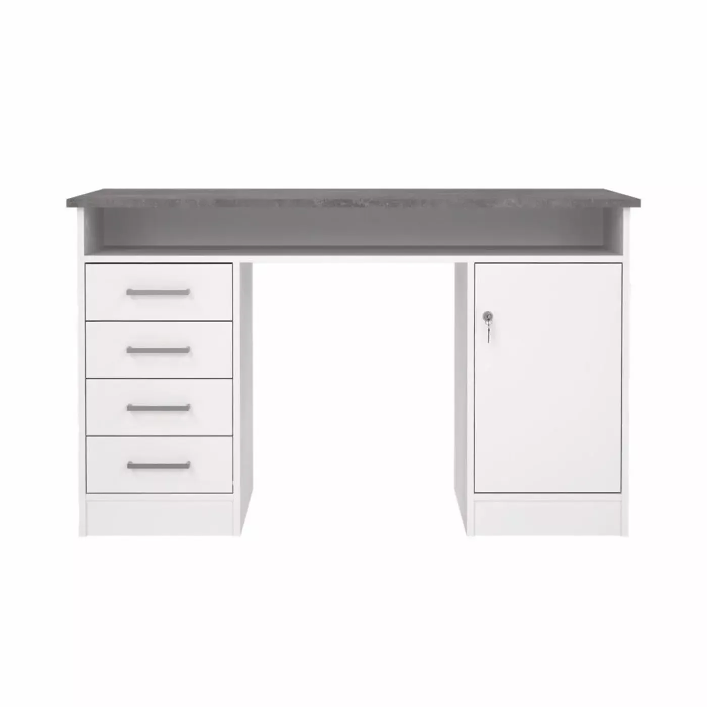 Scrivania con quattro cassetti, un'anta e un ripiano, Bianca e Grigio cemento