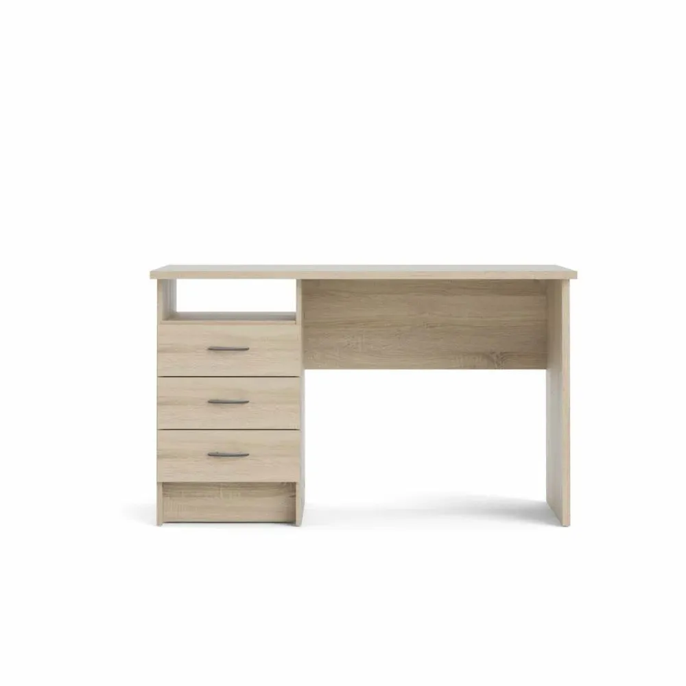 La scrivania possiede uno scomparto aperto nella parte superiore e tre cassetti per inserire i vari documenti. Presenta un design semplice e moderno. Il vano a giorno oltre a garantire un rapido accesso assicura tutta la comodità di cui si ha bisogno per lavorare in un ambiente ordinato e organizzato. La scrivania è disponibile in versione Bianco e Bianco,Quercia.