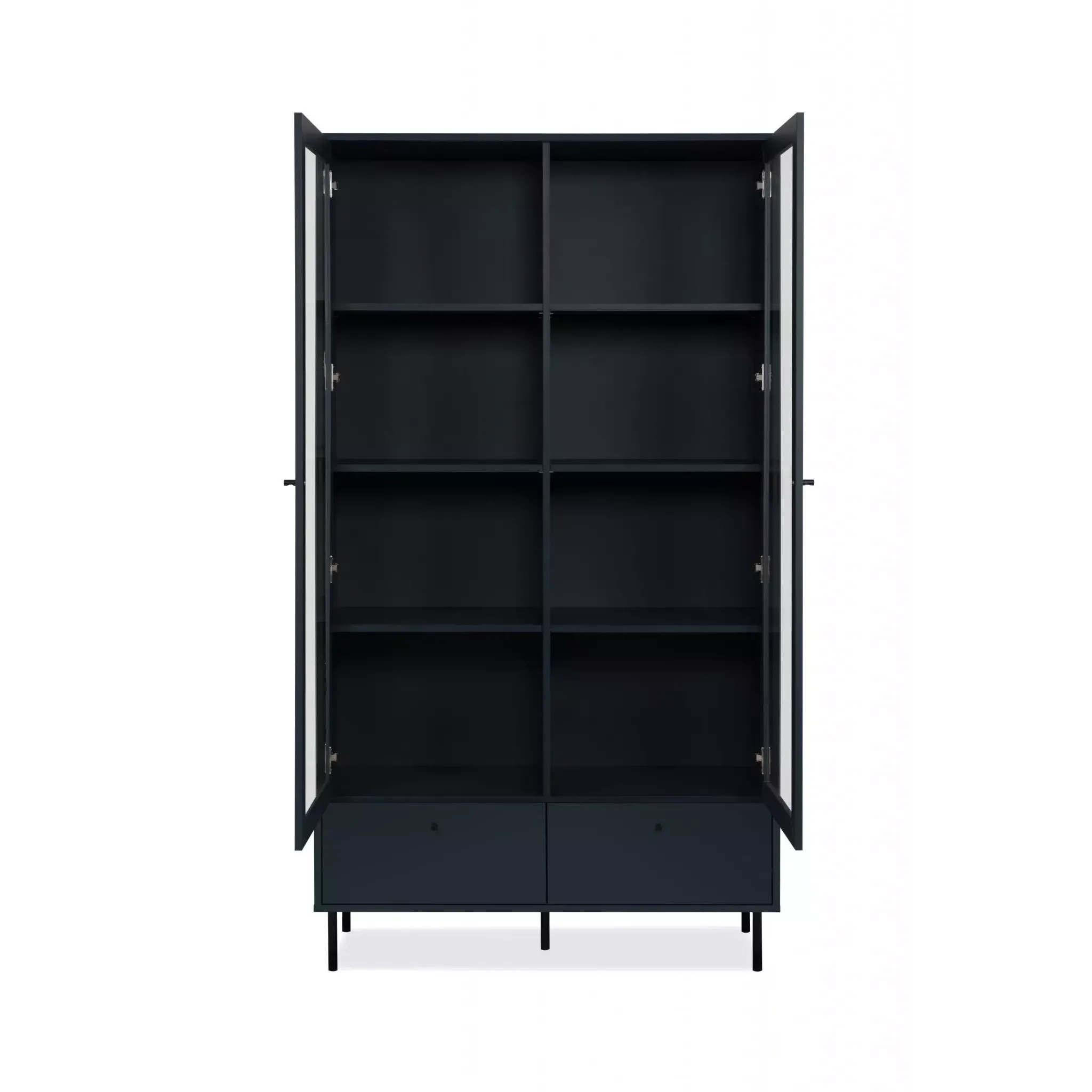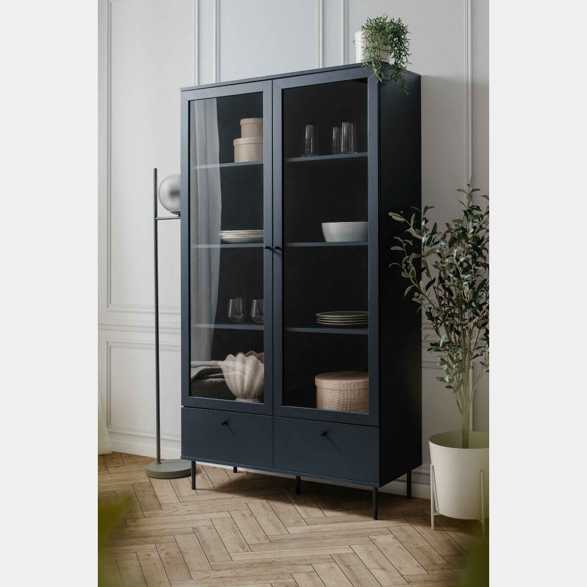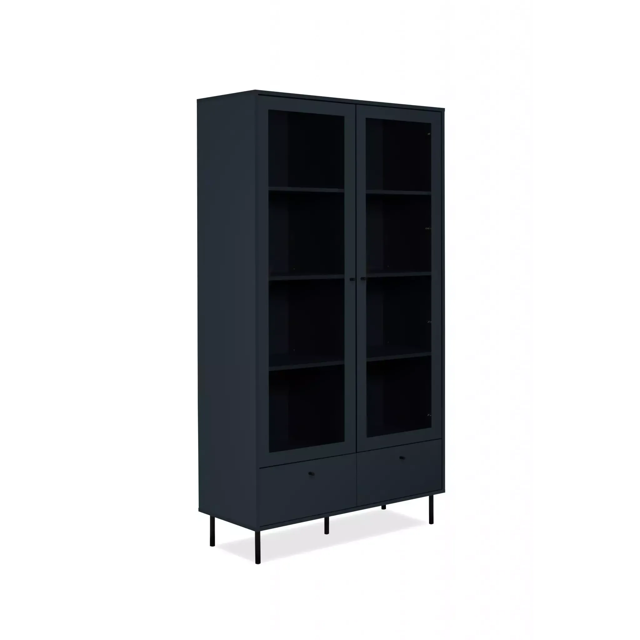 La vetrina è nella finitura Blu scuro, presenta 2 ante battenti con ripiani interni, offre un ampio spazio di appoggio interno e risulta pratica e funzonale.