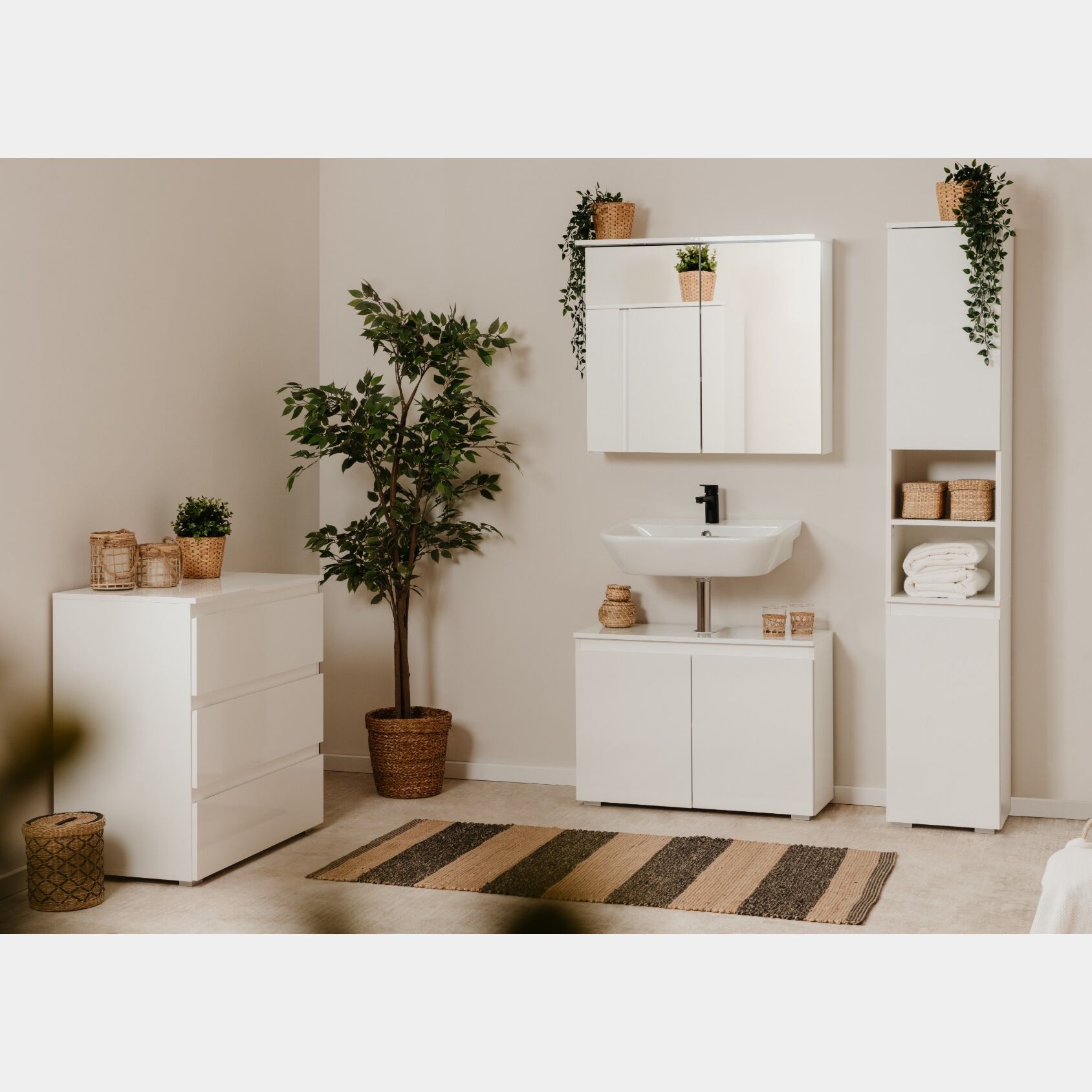 Funzionale Bagno moderno completo in finitura Bianco lucido composto da diversi elementi : mobile specchio contenitore, mobile basso a 2 ante, colonna e cassettiera a 3 cassetti.