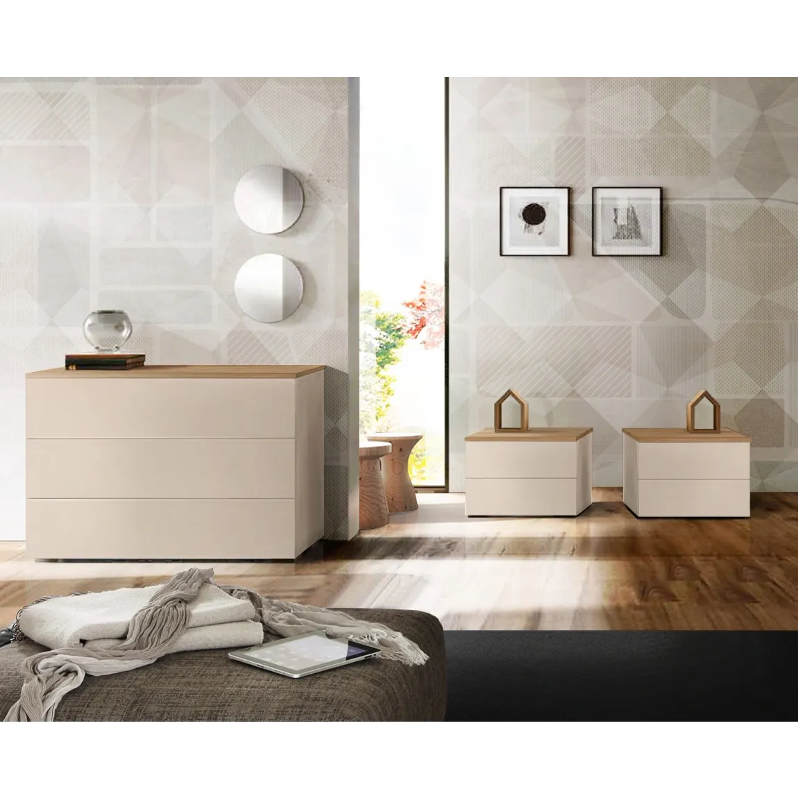 Il comò presenta tre ampi cassetti mentre i comodini sono dotati di due cassetti, l'apertura avviene tramite presa laterale.