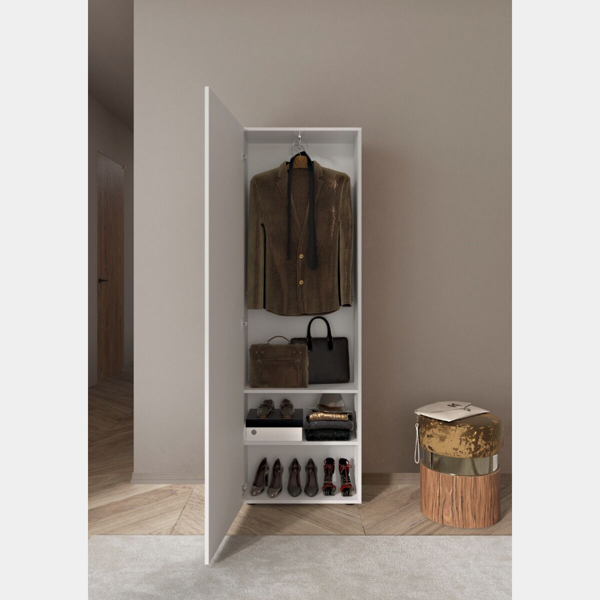 E' dotato di 1 anta battente e diviso internamente in due ripiani e un tubo appendiabiti.