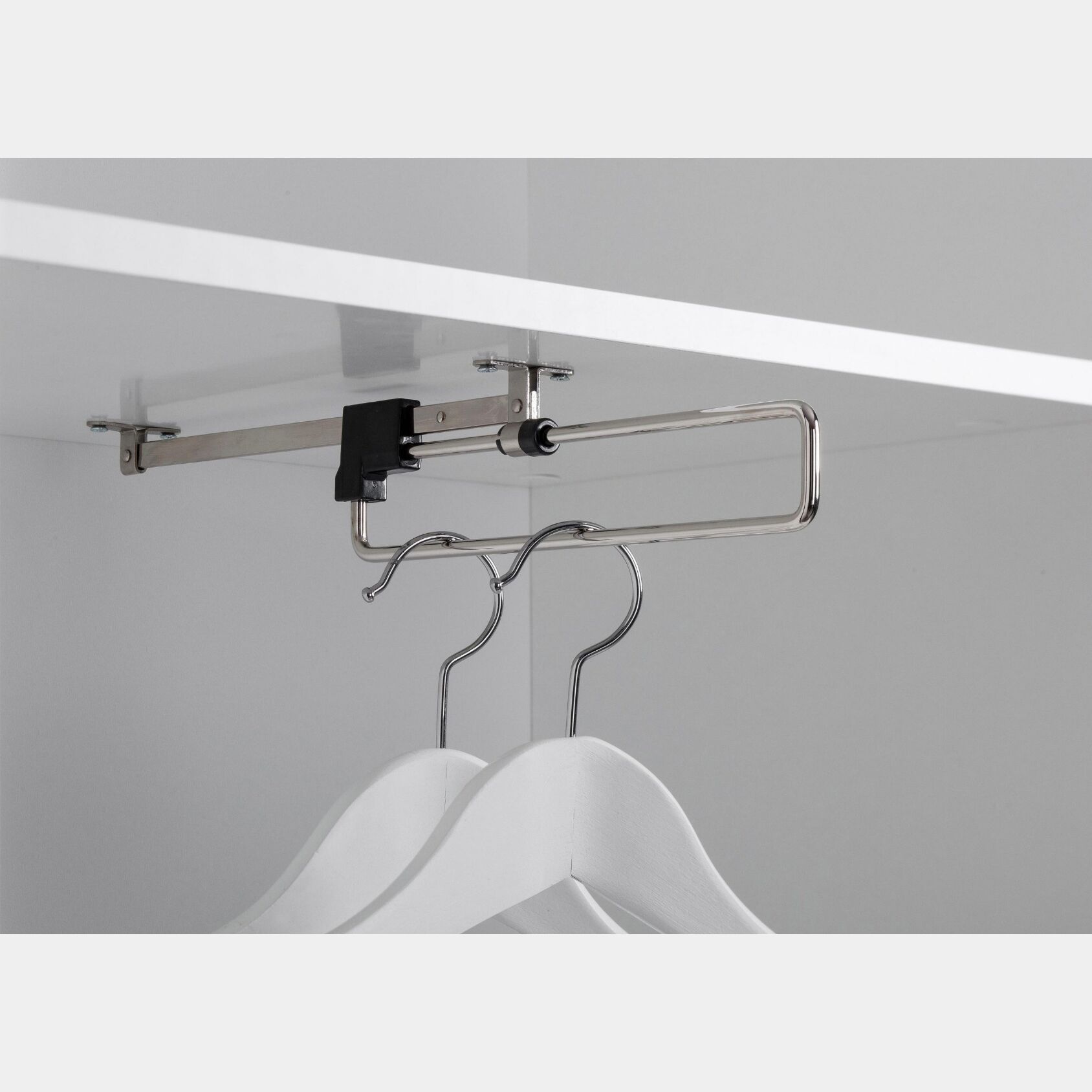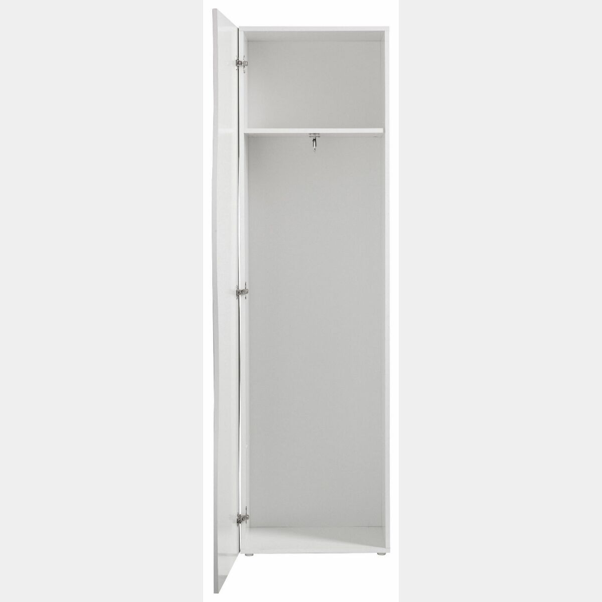 Guardaroba d'ingresso dalle linee ondulate in finitura bianco laccato lucido. All'interno un tubo appediabiti e un ripiano.