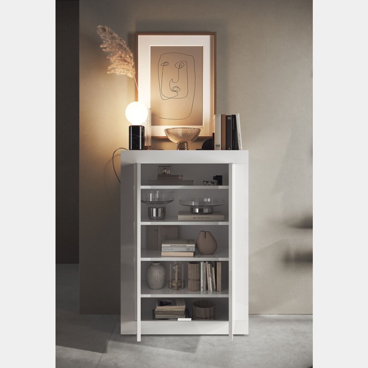 Pratica e funzionale è composta da 2 ante e 4 ripiani interni adatti per contenere tutti i vostri libri, bicchieri o piatti e mantenere così sempre la vostra zona living in ordine.