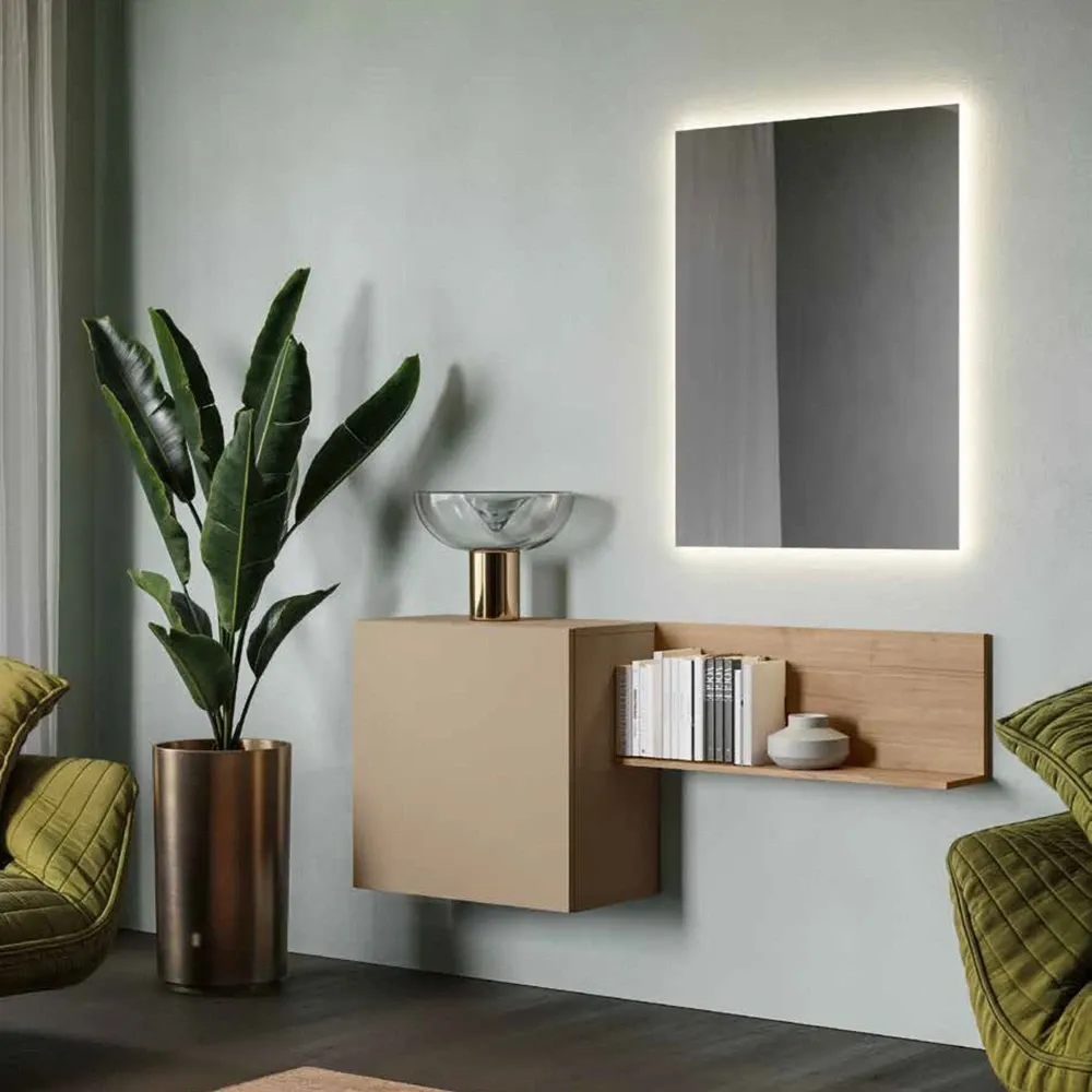 E' possibile richiedere tramite configuratore la specchiera rettangolare L.69 H.71 P.2 cm, con o senza retroilluminazione. (Accensione luce a presa corrente. Luce 3000K)