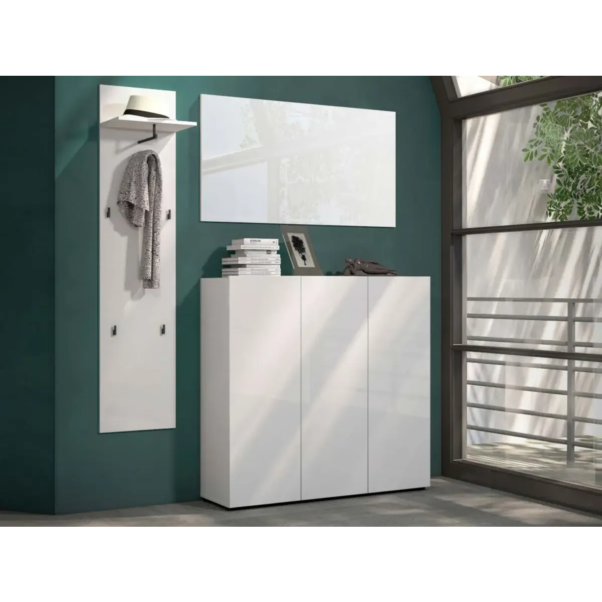 Ingresso moderno composto da Madia 3 ante, Appendiabiti e Specchio finitura Bianco lucido