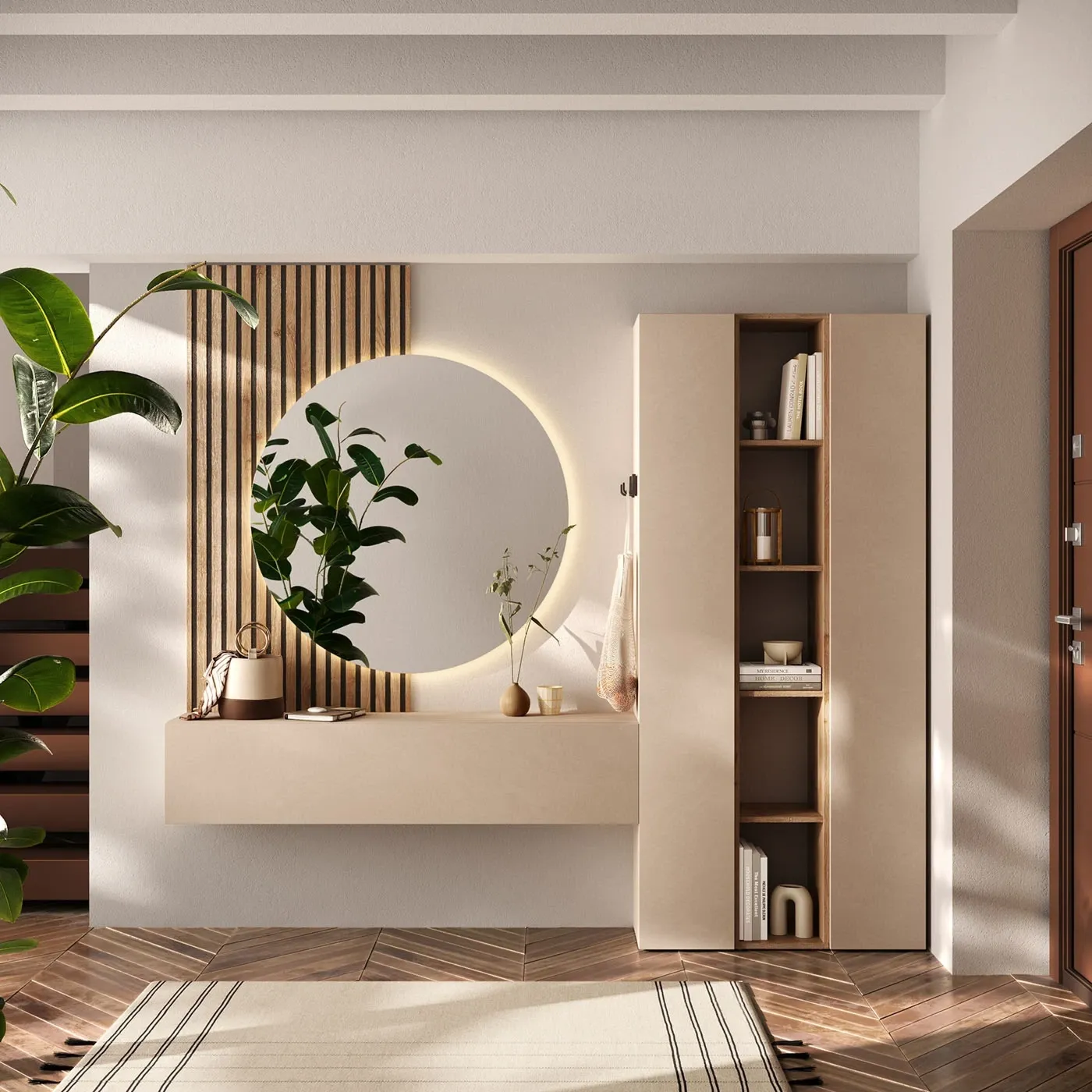 L'ingresso si apre su un'elegante boiserie in Cadiz cannettato a rilievo. Le doghe verticali in legno incorniciano perfettamente lo specchio ovale retroilluminato (OPTIONAL), che, con la sua luce calda e soffusa, illumina delicatamente l'ambiente e mette in risalto la bellezza del legno.