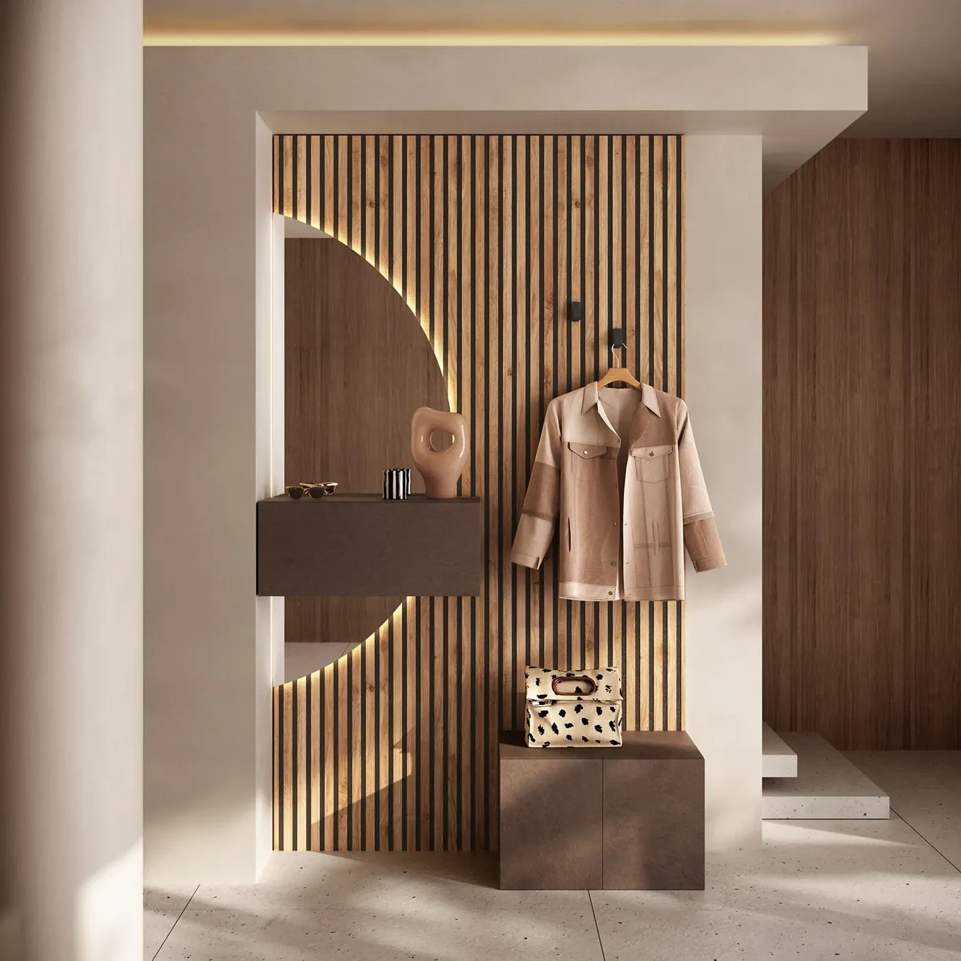 L'ingresso si presenta con una raffinata boiserie in Mercure cannettato a rilievo, le cui doghe verticali in legno creano la cornice ideale.