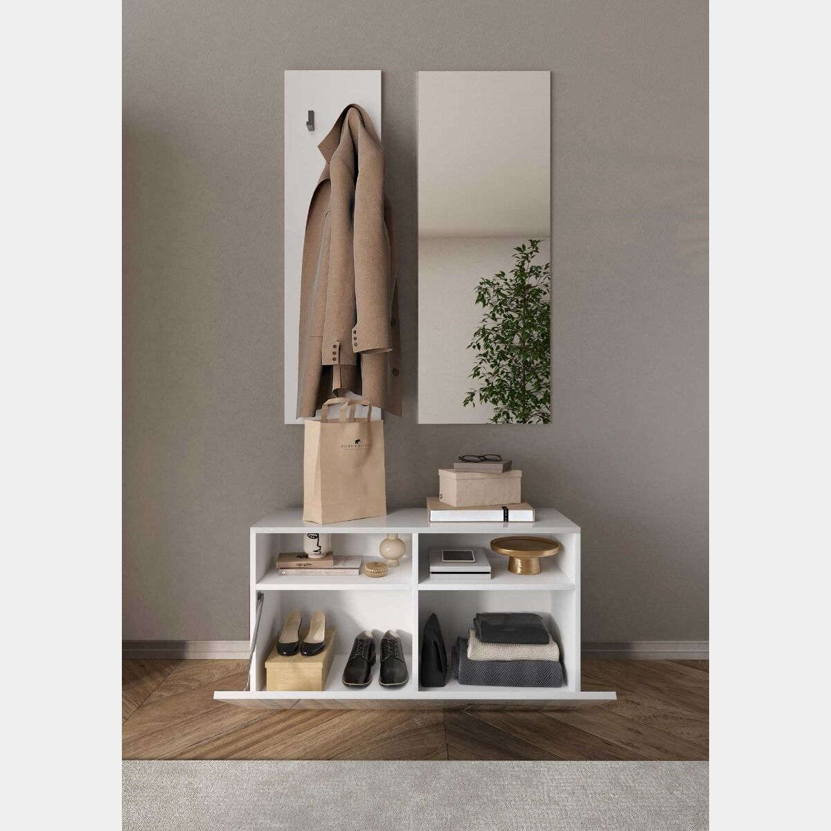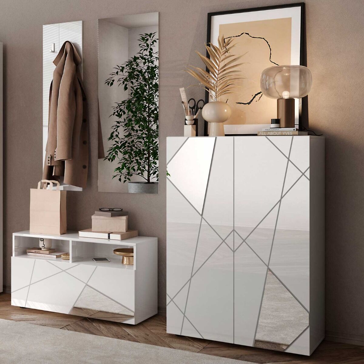 Ingresso moderno con madia, panca, appendiabiti e specchio, bianco lucido con serigrafie