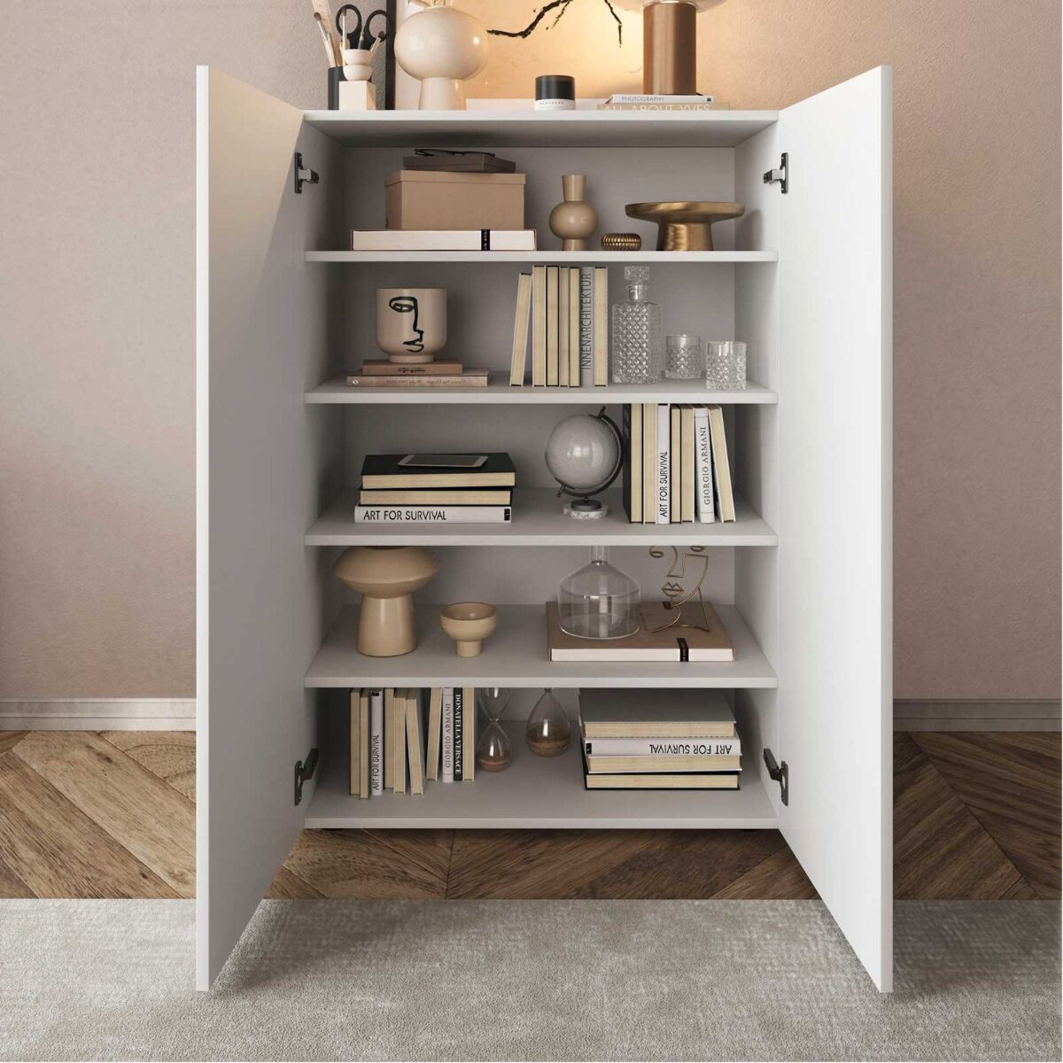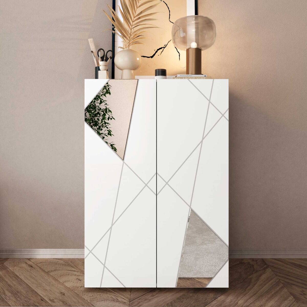 Il mobile alto 2 ante in finitura Bianco lucido con dettagli specchio è la soluzione ideale da inserire nella zona living, grazie al suo design elegante, che colpisce per l'originalità. Pensato e progettato per abbellire la zona giorno e la funzionalità dell'ingresso, questo mobile permette di ottimizzare al meglio gli spazi.