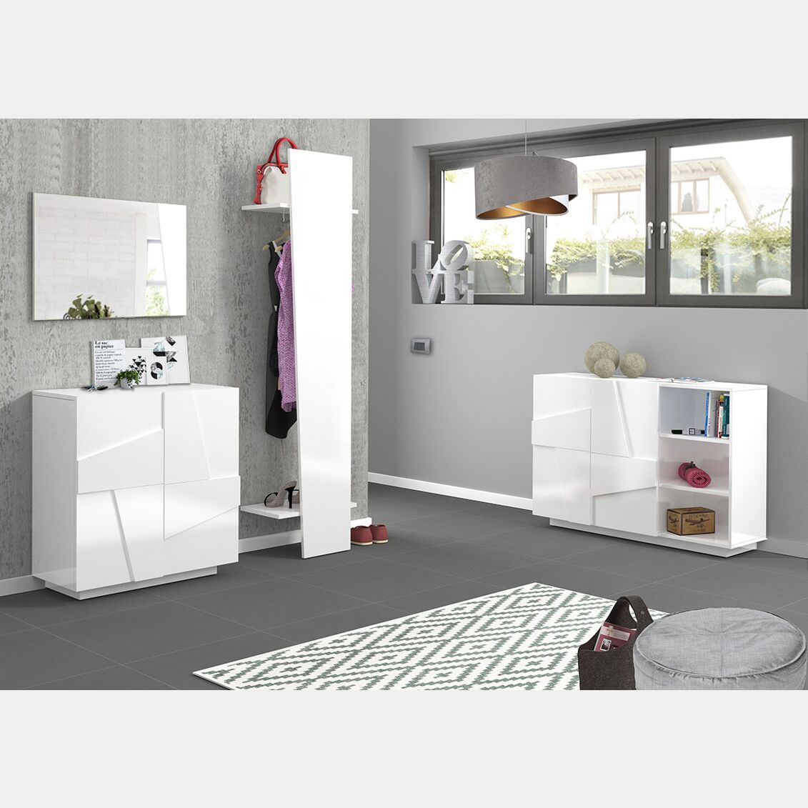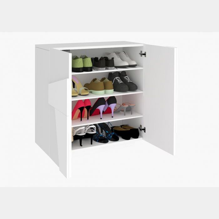 La composizione d'ingresso è formata da una scarpiera a 2 ante, una madia a 2 ante e 2 ripiani e un appendiabiti, tutto in finitura bianco lucido.