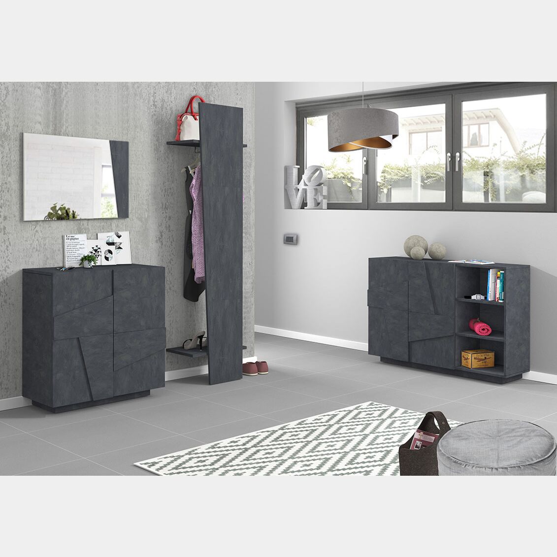 La composizione d'ingresso è formata da una scarpiera a 2 ante, una madia a 2 ante e 2 ripiani e un appendiabiti, tutto in finitura ardesia.