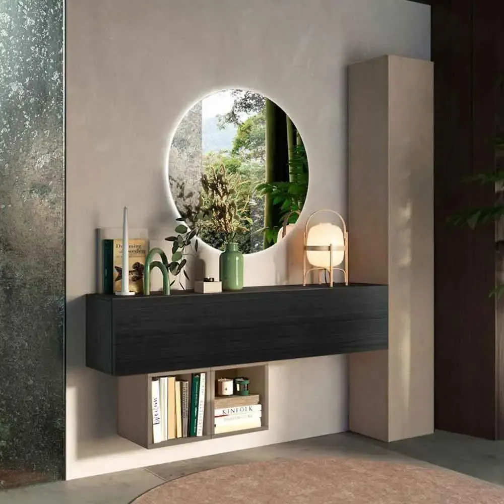 L'ingresso presenta un design moderno e di impatto, caratterizzato da uno specchio tondo (optional) retroilluminato e da pensili a contrasto assicura all'ambiente uno stile elegante e ricercato.