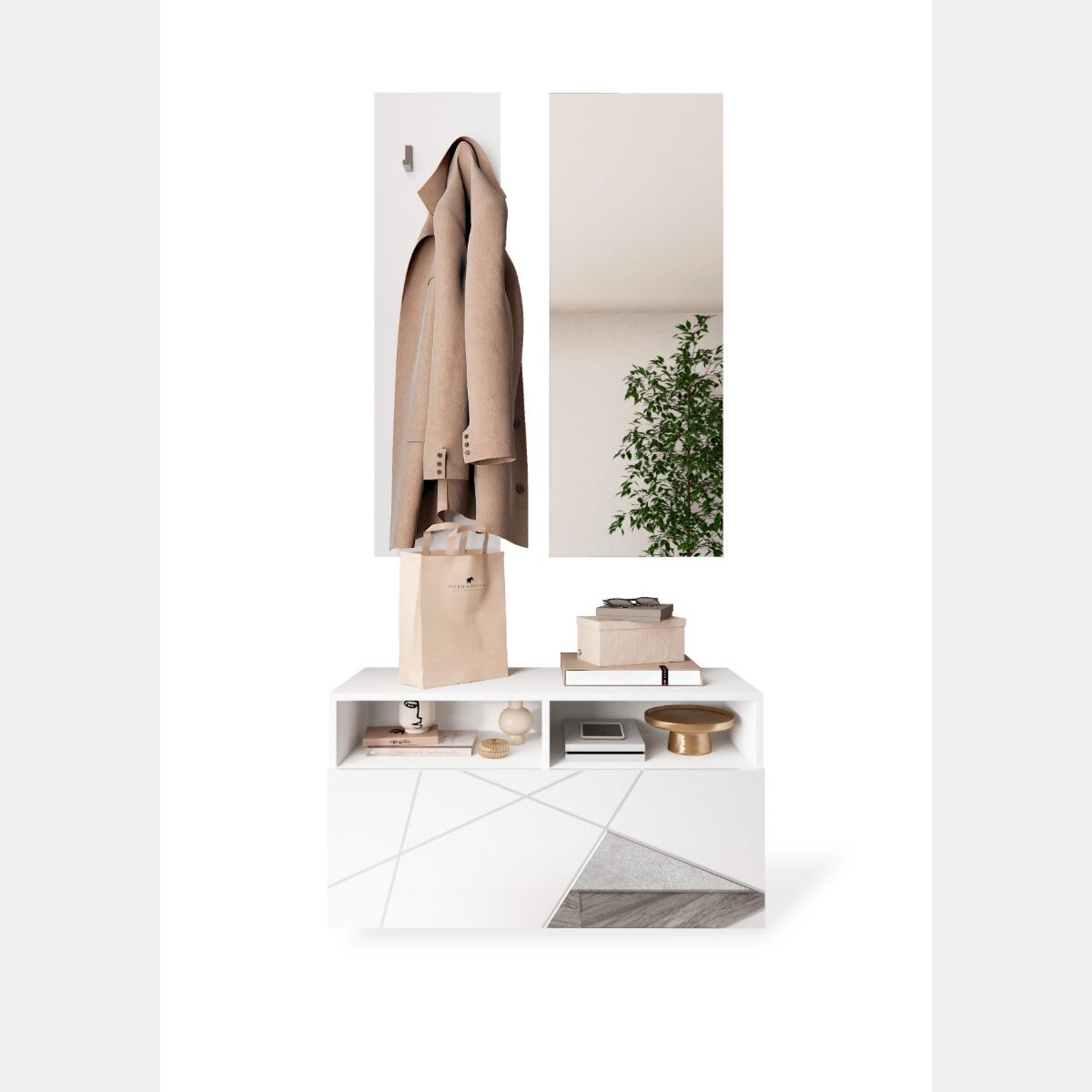 Innovativo Mobile da ingresso geometrico finitura Bianco lucido con dettagli a specchio