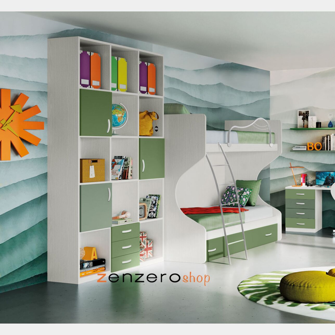 Questo letto a castello si può avere con 3 letti oppure con 2 letti e cassettoni contenitivi per riporre le cose. Offre un rapporto qualità/prezzo imbattibile. Il letto a castello è composto da un divano letto (rete a doghe non inclusa nel letto superiore, optional 104,00 euro), un secondo letto ad estrazione con rete già inclusa, e un letto superiore. A questo letto si puo decidere di aggiungere anche la rete a doghe oppure di poggiare il materasso direttamente sulla pianetta. La struttura del letto a castello è bianco frassino, mentre il cassettone con maniglie è Verde.