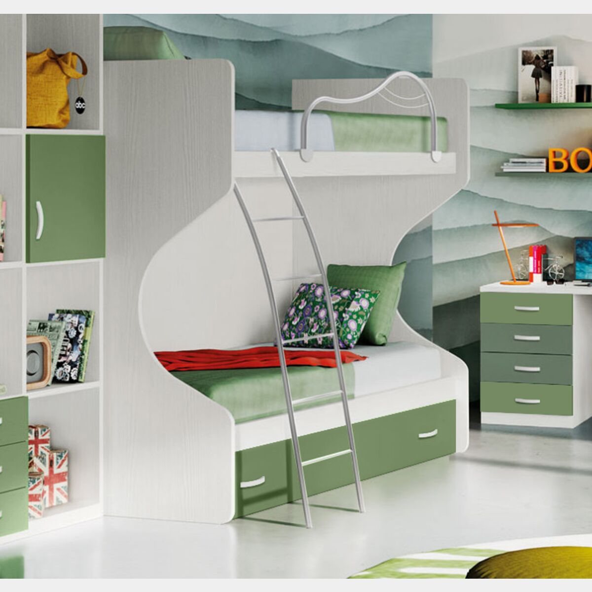 Letto a castello con 3 letti, finitura Bianco frassino e Verde Giada