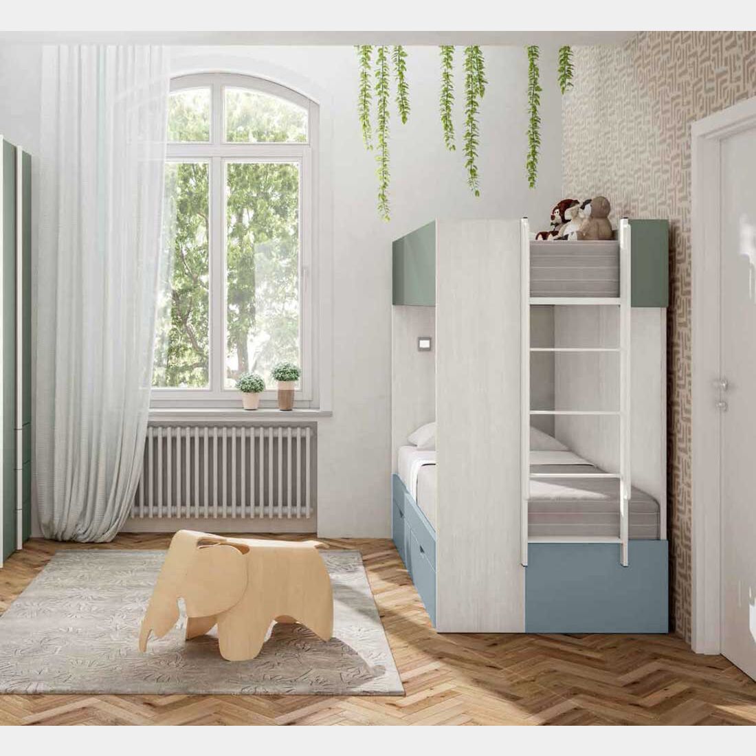 Grazie alla personalizzazione delle finiture si adatta ad ogni tipo di ambiente, donando calore e rendendo la cameretta accogliente. E' dotato di 2 letti a castello, la rete inferiore non è inclusa (90x190).