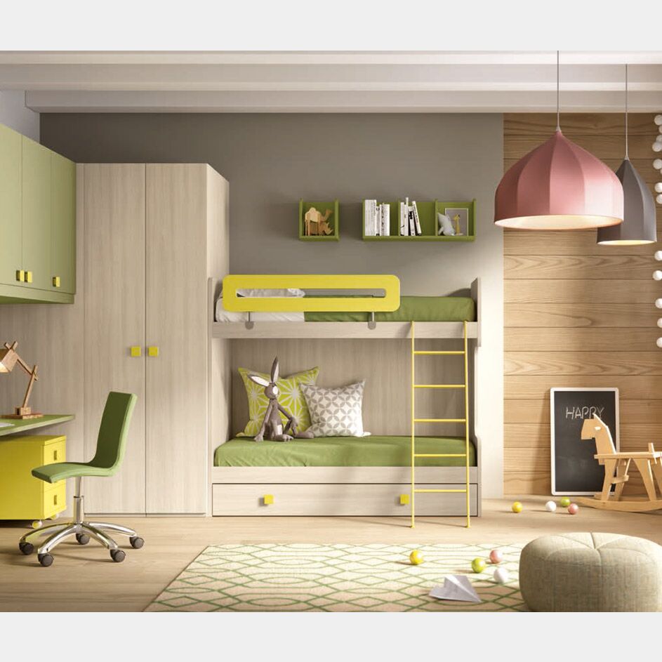 Le finiture in Olmo, Lime e Muschio si mesolano creando un gioco di colori accattivante. E' possibile scegliere tra un'ampia gamma di colori per rendere il letto unico e personalizzato. Il letto a castello presenta un design moderno, per questo si adatta a tutte le camerette donando luce e calore all'ambiente. Le maniglie del letto ad estrazione presentano un design funzionale e pratico, la loro finitura accesa contrasta quella delicata della strutta in Olmo. (Le finiture, tranne quelle essenza, sono laccate).