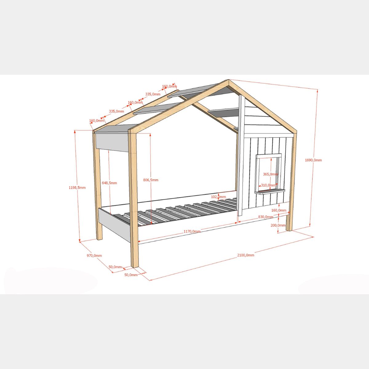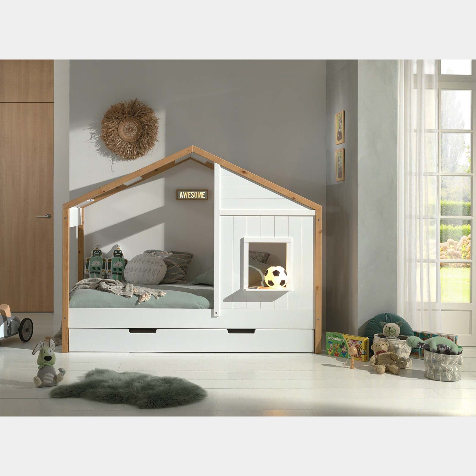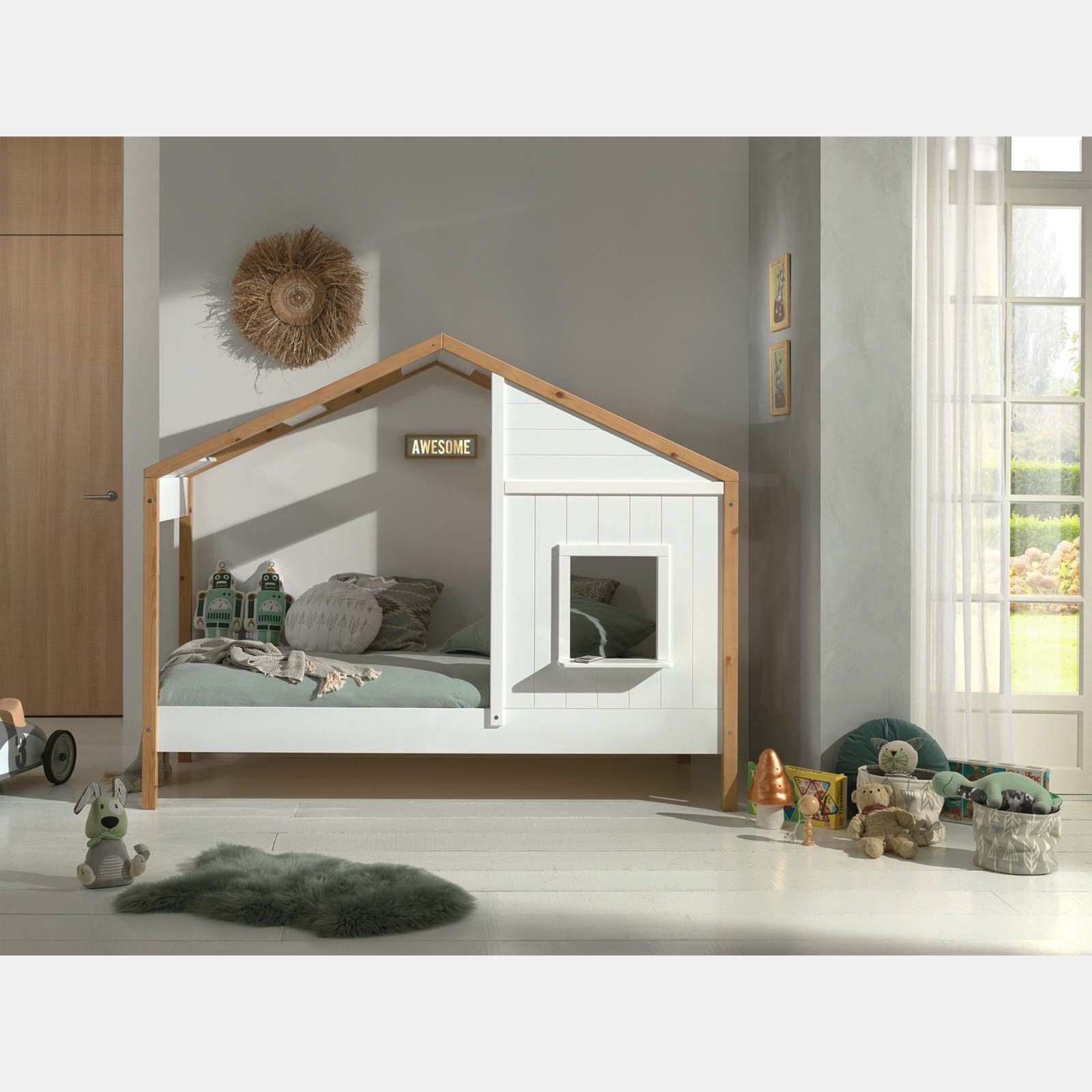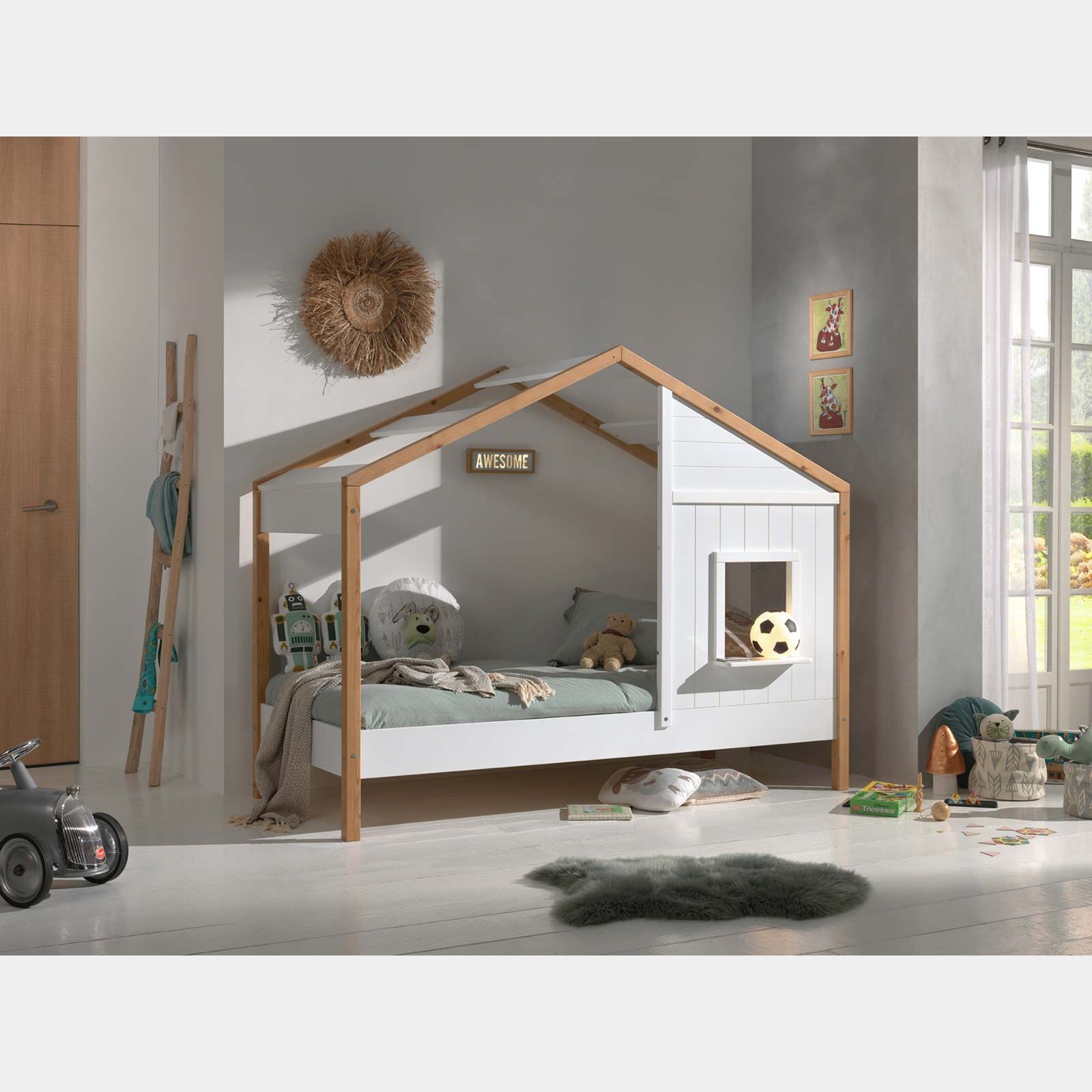 Lettino montessoriano a casetta per bambini, Bianco e Rovere naturale