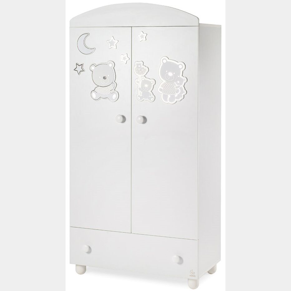 L'armadio ha 2 mensole e 2 tubi appendiabiti, piedini regolabili e decoro tortora.