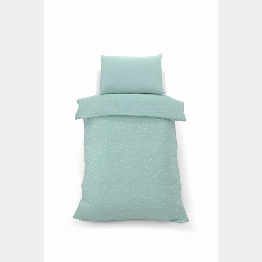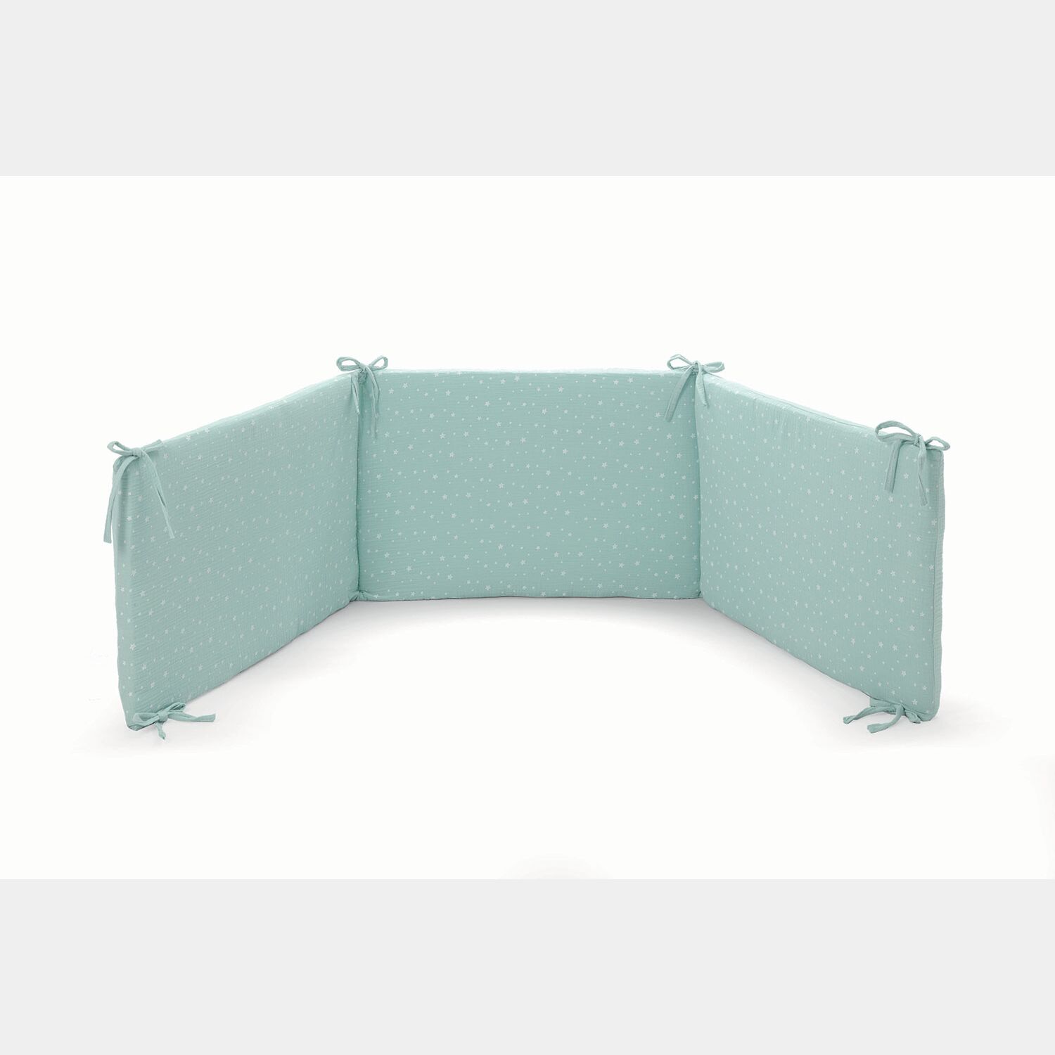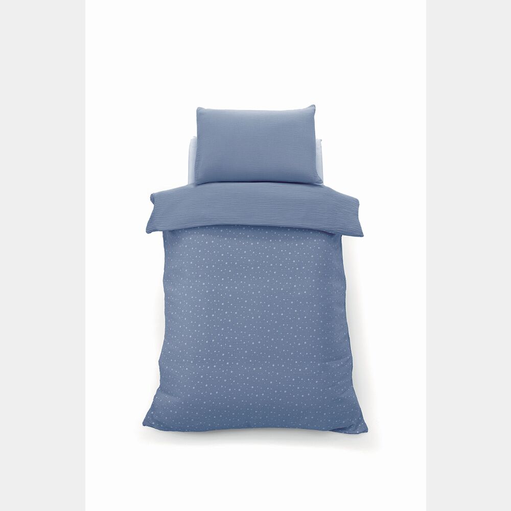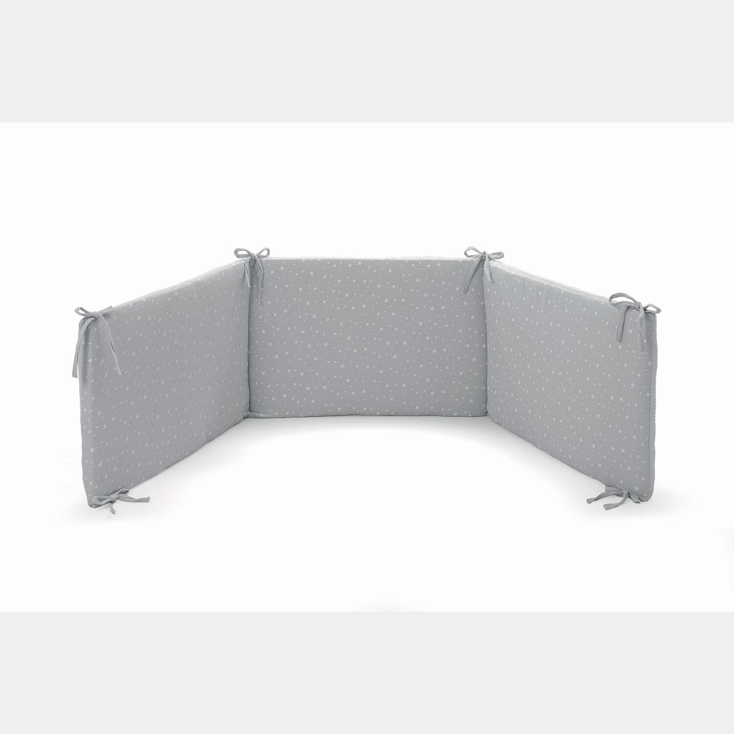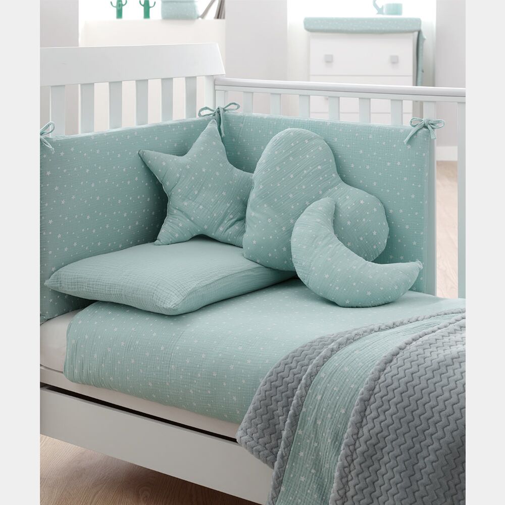 Il set piumoni è composto da 4 elementi: federa per guanciale, paracolpi 3 lati, sacco copripiumino, piumino. Sono disponibili quattro colorazioni con stelline: Grigio, Verde acqua, Blu e Rosa.