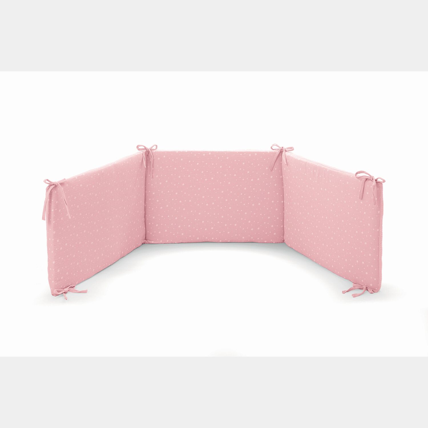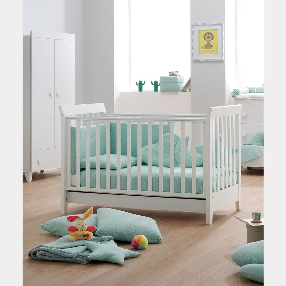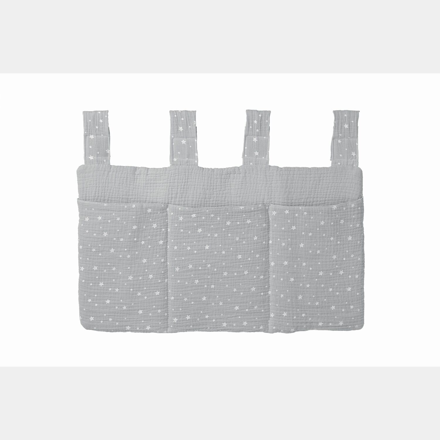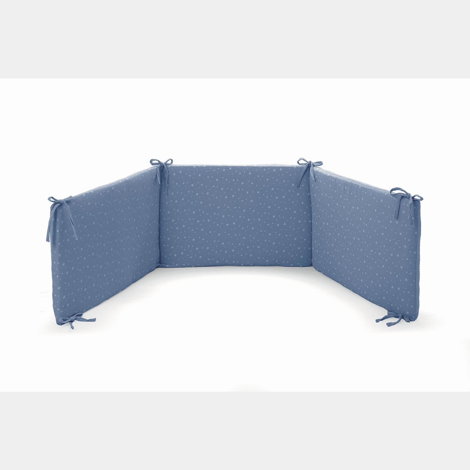 Il set piumoni è composto da 4 elementi: federa per guanciale, paracolpi 3 lati, sacco copripiumino, piumino. Sono disponibili quattro colorazioni con stelline: Grigio, Verde acqua, Blu e Rosa.