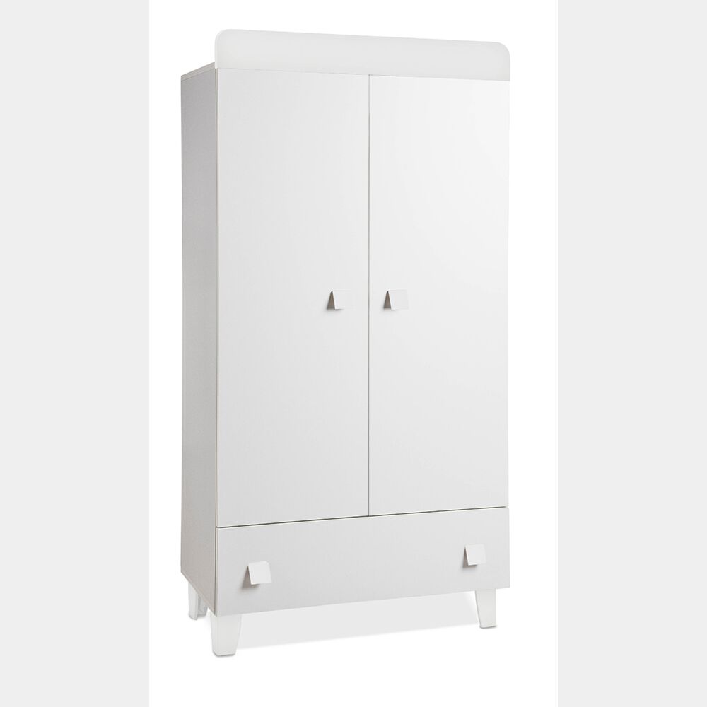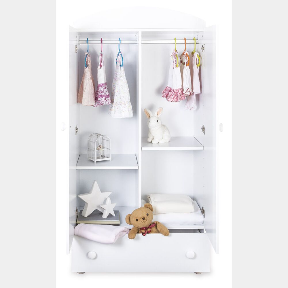 Questo armadio ti permetterà di ordinare e organizzare facilmente i vestiti del tuo piccolo grazie al lato guardaroba e al comodo cassettone che scorre su guide in metallo. L'interno è realizzato con un divisorio centrale, lo spazio interno è attrezzato con due ripiani e 2 appendiabiti. Eventuali ripiani aggiuntivi sono disponibili a richiesta. Ante e cassetto sono dotati di sistema di chisura soft close.