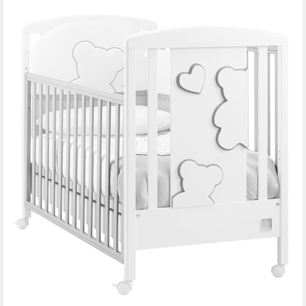 Il lettino Winnie bianco è realizzato in massello di faggio, le sponde, a norma di sicurezza, sono rivestite con guaina gengivale in materiale plastico atossico. Gli spigoli sono arrotondati per garantire la massima sicurezza. La rete a doghe è in massello di faggio con vernici atossiche, posizionabile su 2 altezze.