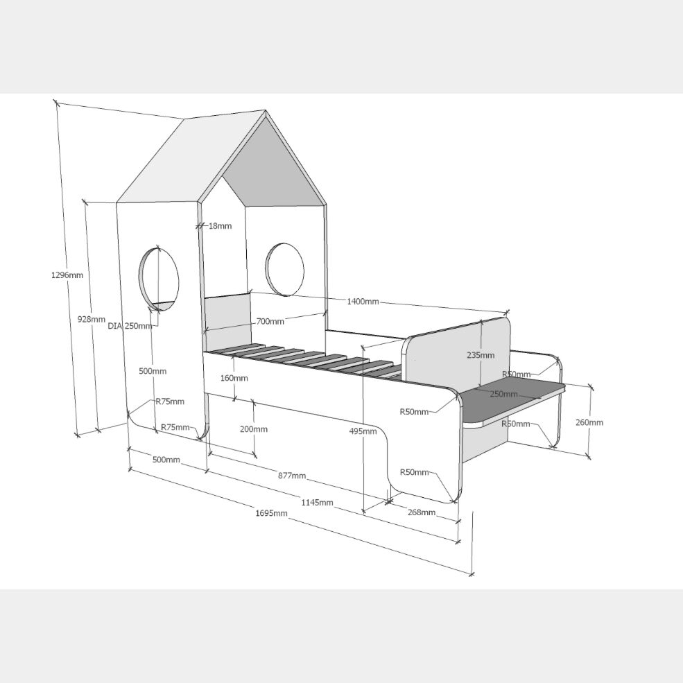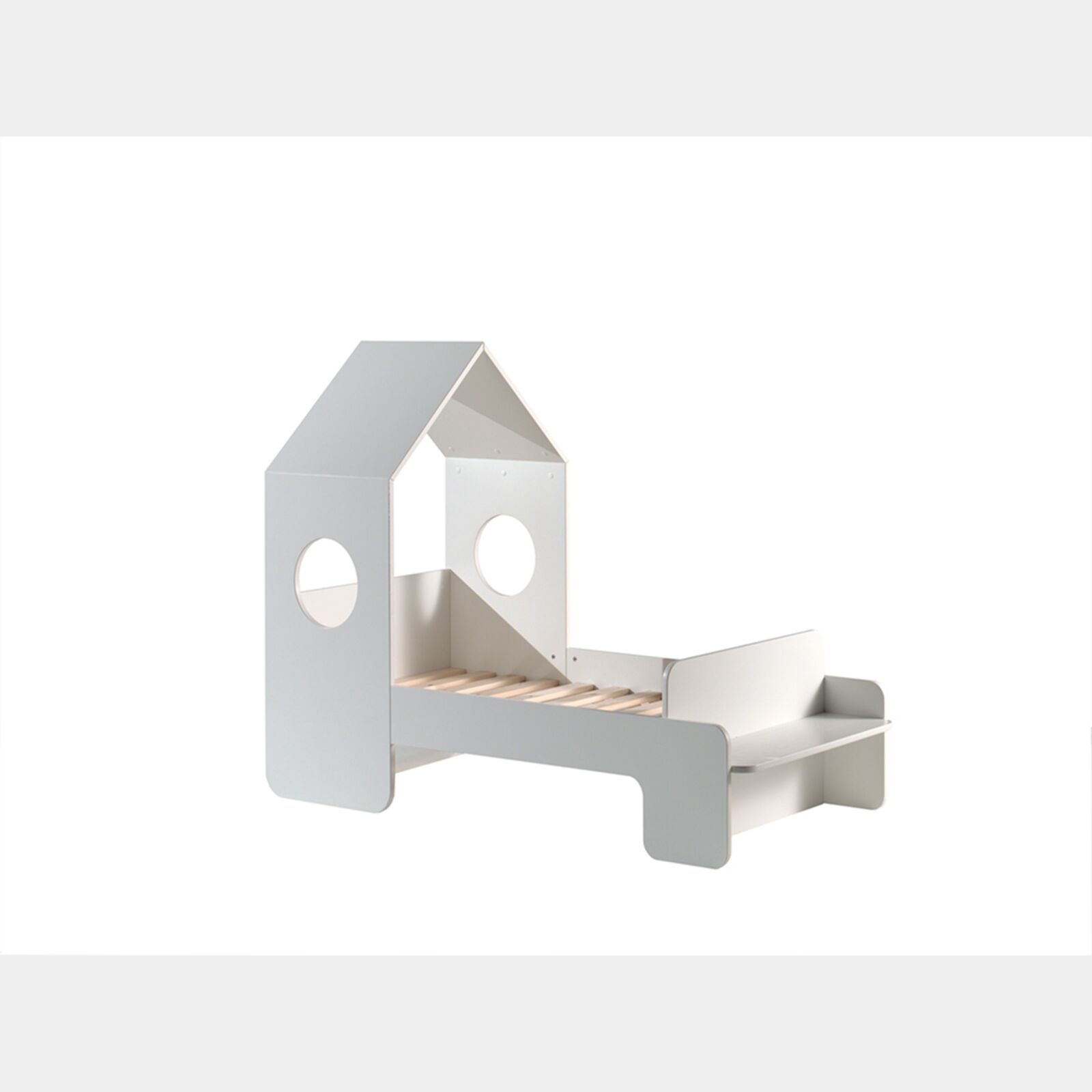Il lettino prima infanzia per bambini presenta una caratteristica testata a tetto con due finestre tonde ai lati e una pratica panchetta per sedersi o posizionare giochi e peluches. La finitura è Bianco laccato, il letto viene fornito con rete a doghe nelle dimensioni di 70x140, è disponibile anche nella versione 90x200.
