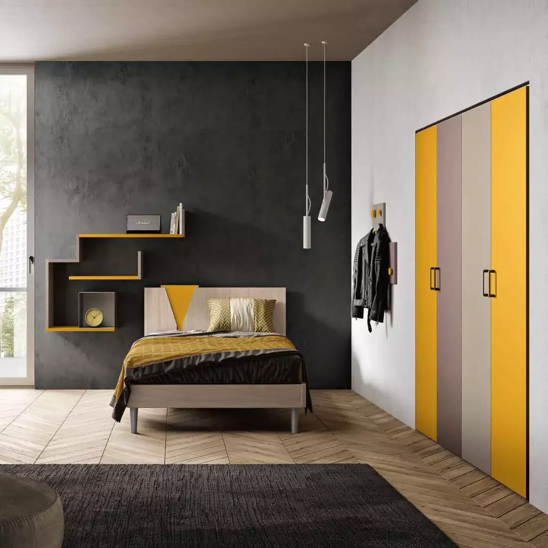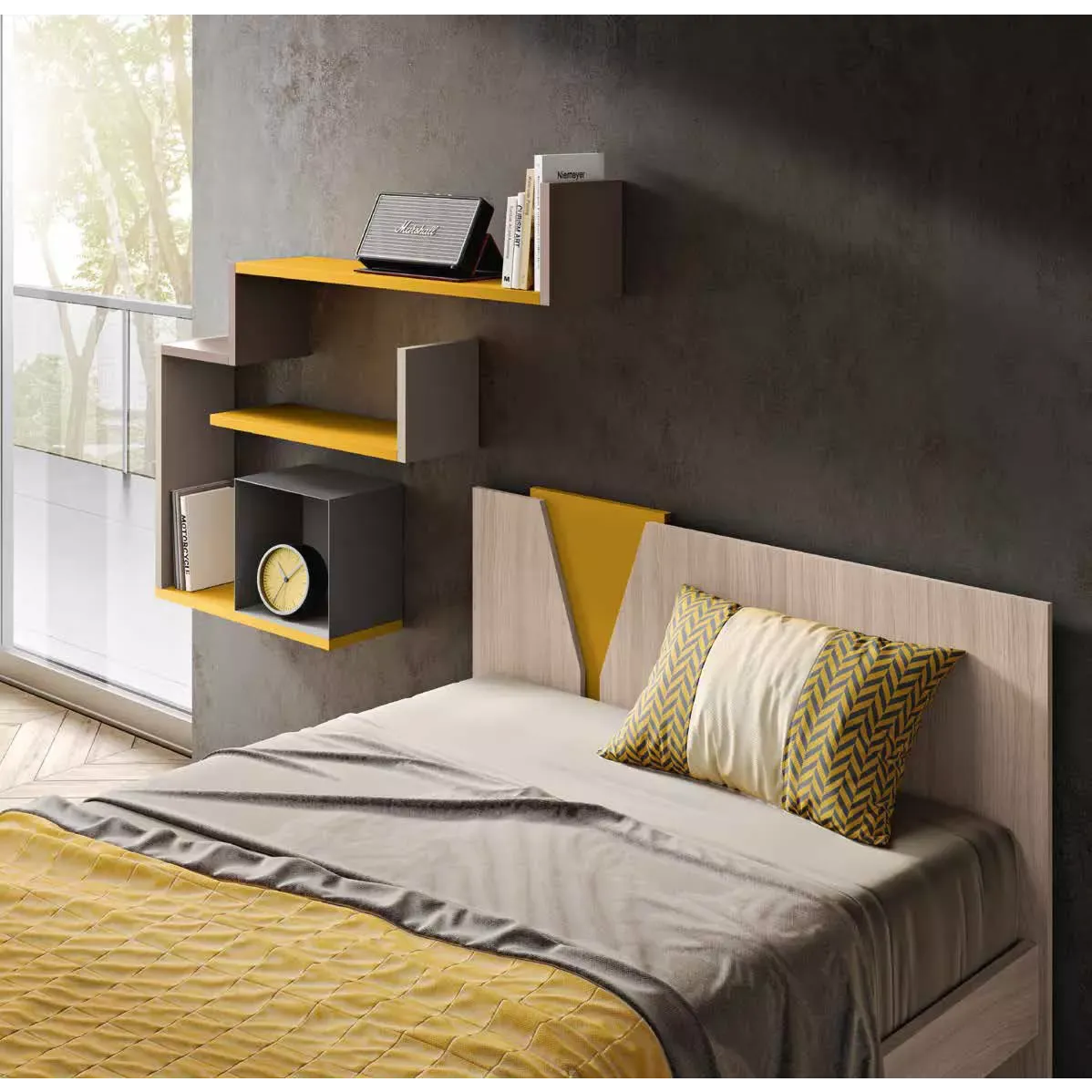 La delicata finitura Olmo viene valorizzata da un inserto Giallo in testata, dettaglio che cattura l'attenzione e rende il letto unico e originale.