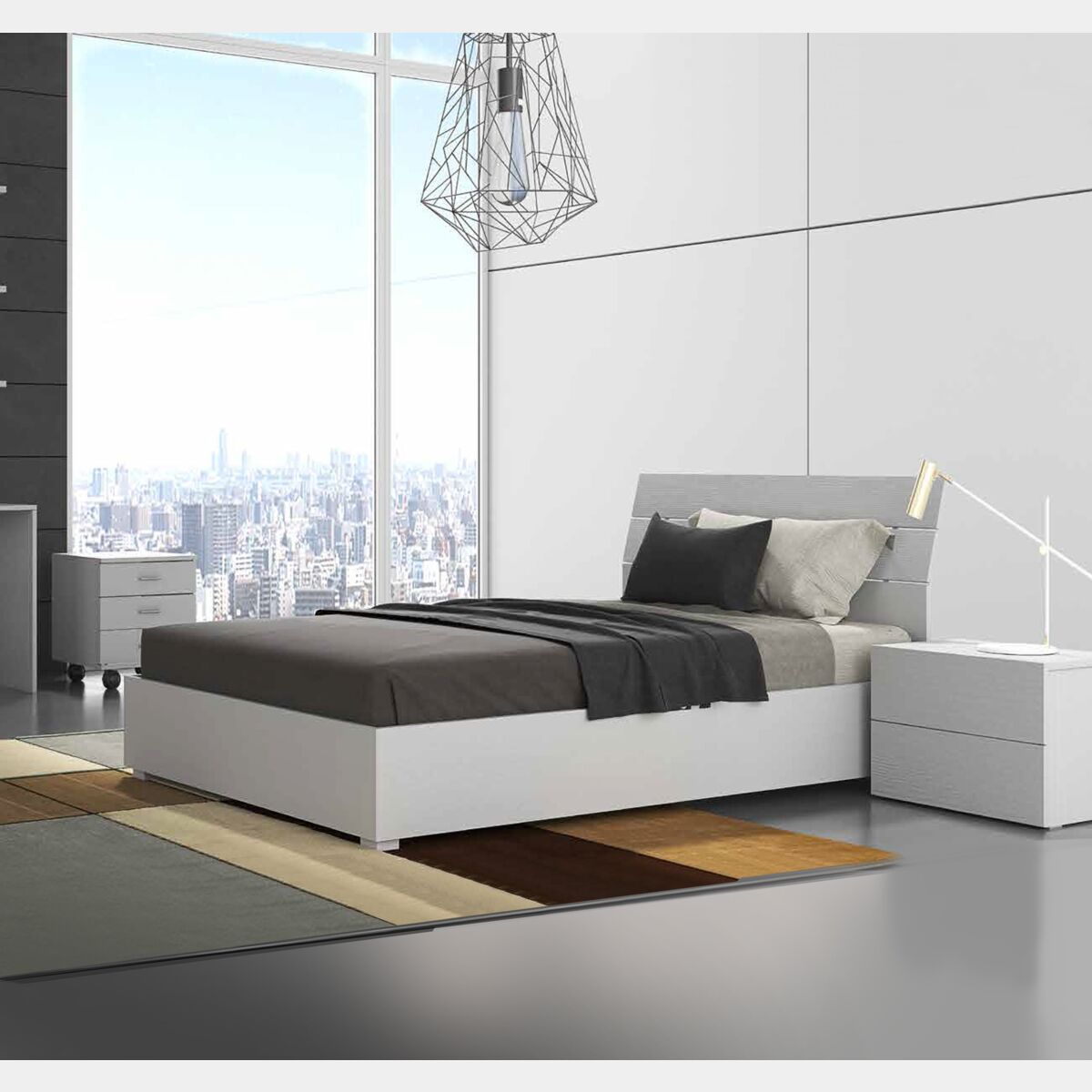 Il letto presenta una particolare testiera ricurva composta da 3 pannelli che lo rende moderno, la finitura essenza permette di adattarlo ad ogni ambiente, è dotato di rete contenitore.