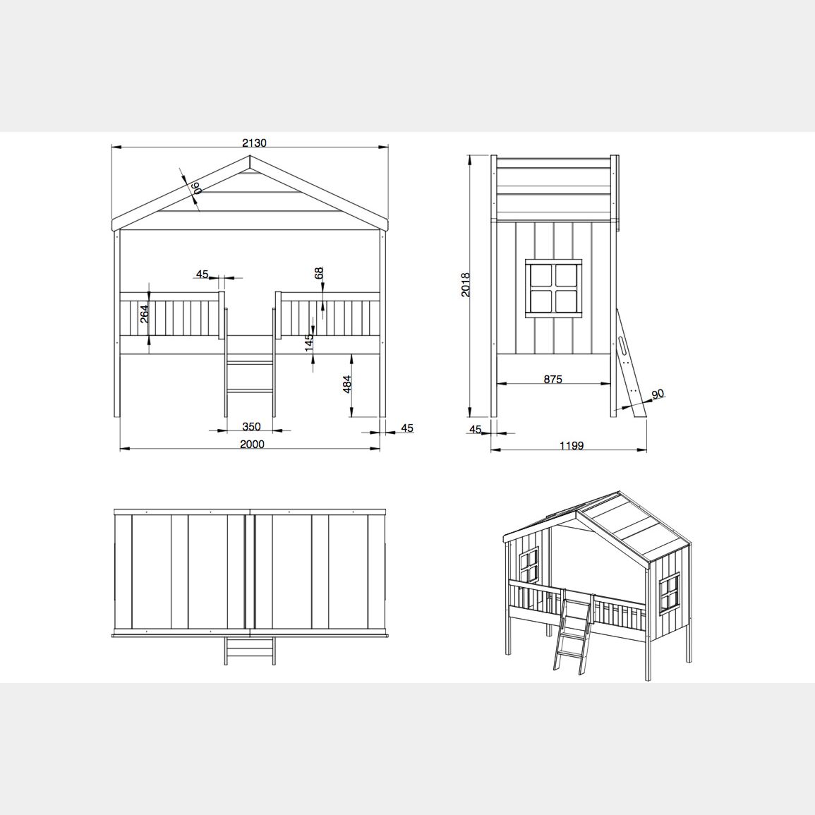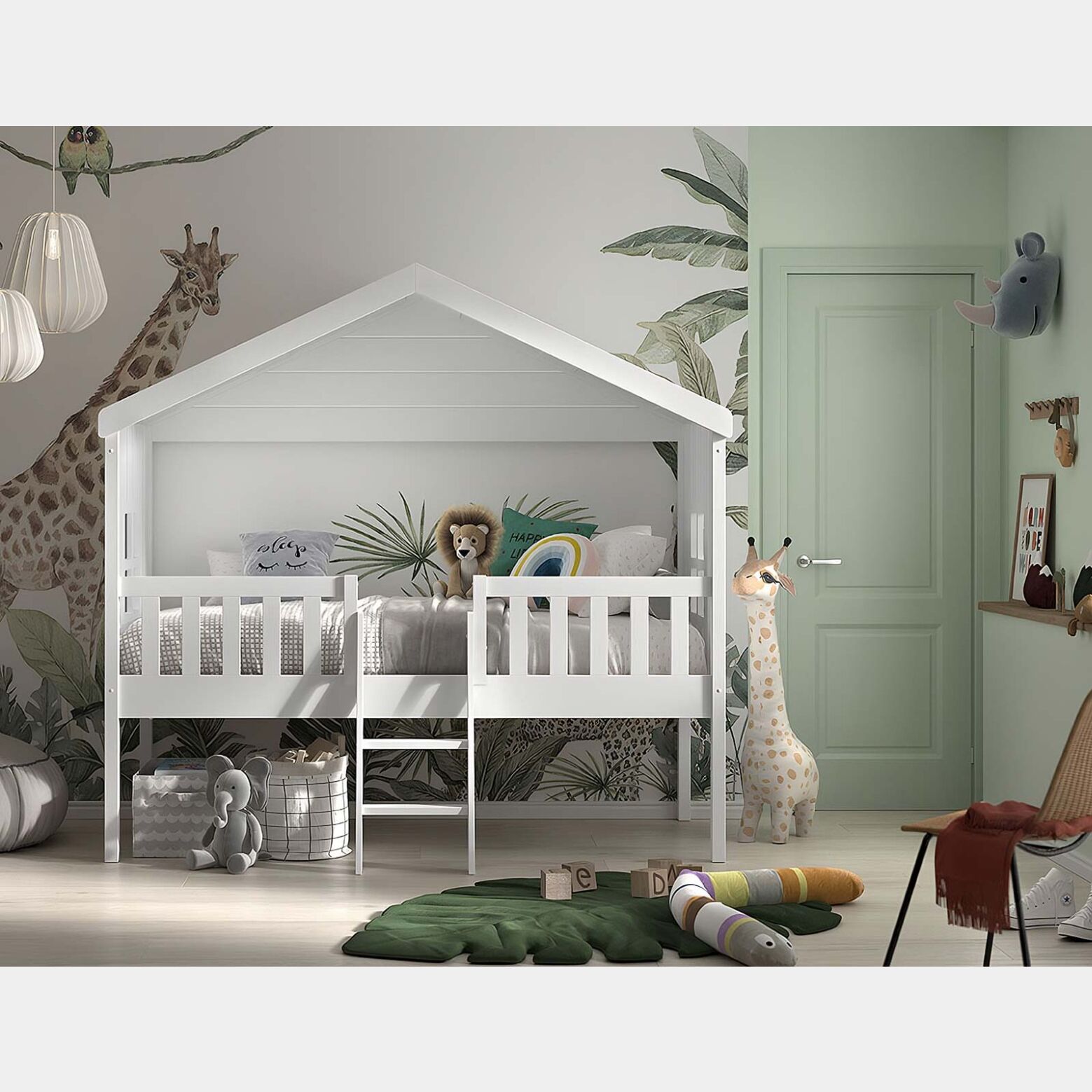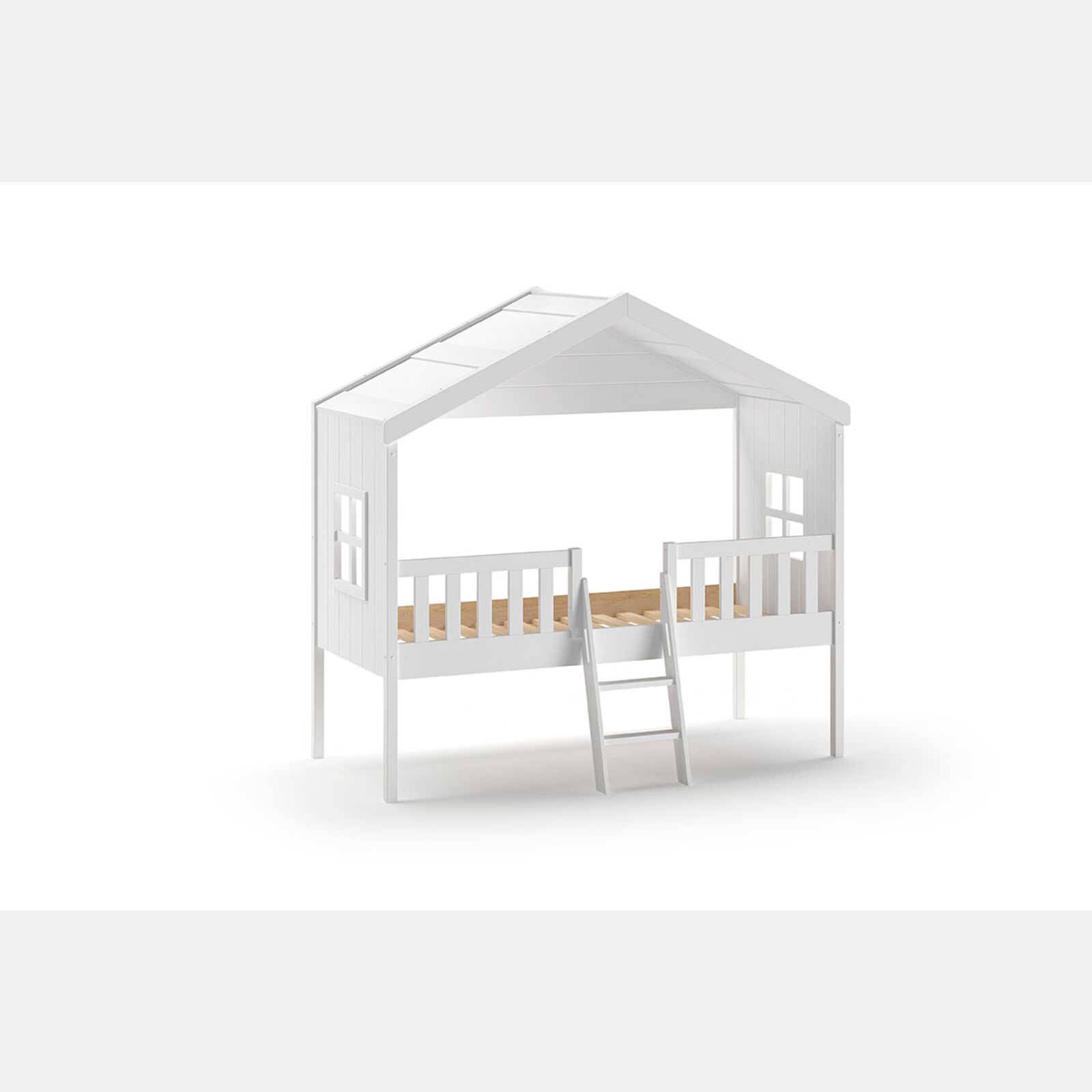 Il letto in bianco è più alto da terra in modo da poter aggiungere una bella scaletta che conferisce immediatamente un carattere giocoso alla cameretta. Il letto è composto da una combinazione di pino scandinavo e mdf e dispone di una protezione anteriore per la sicurezza del bambino e di due finestre ai lati.
