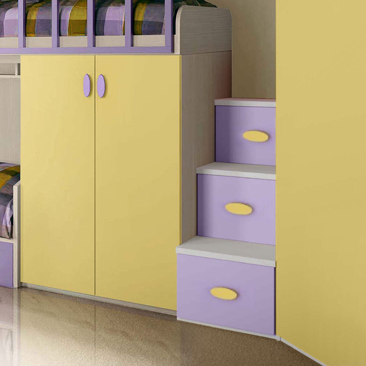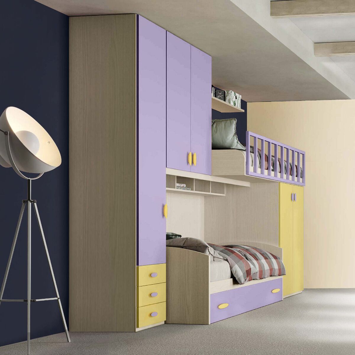Letto a castello bambine, 3 posti letto, finitura Cenere, Malva e Giallo