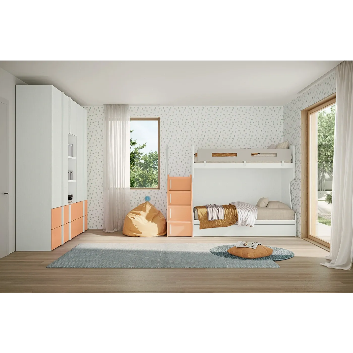 Letto a castello è in finitura Rovere bianco, grazie alla possibilità di personalizzare le finiture si può adattare a qualunque stanzetta. L'ampia scelta di colori permette al letto di essere unico e donare carattere alla camera.