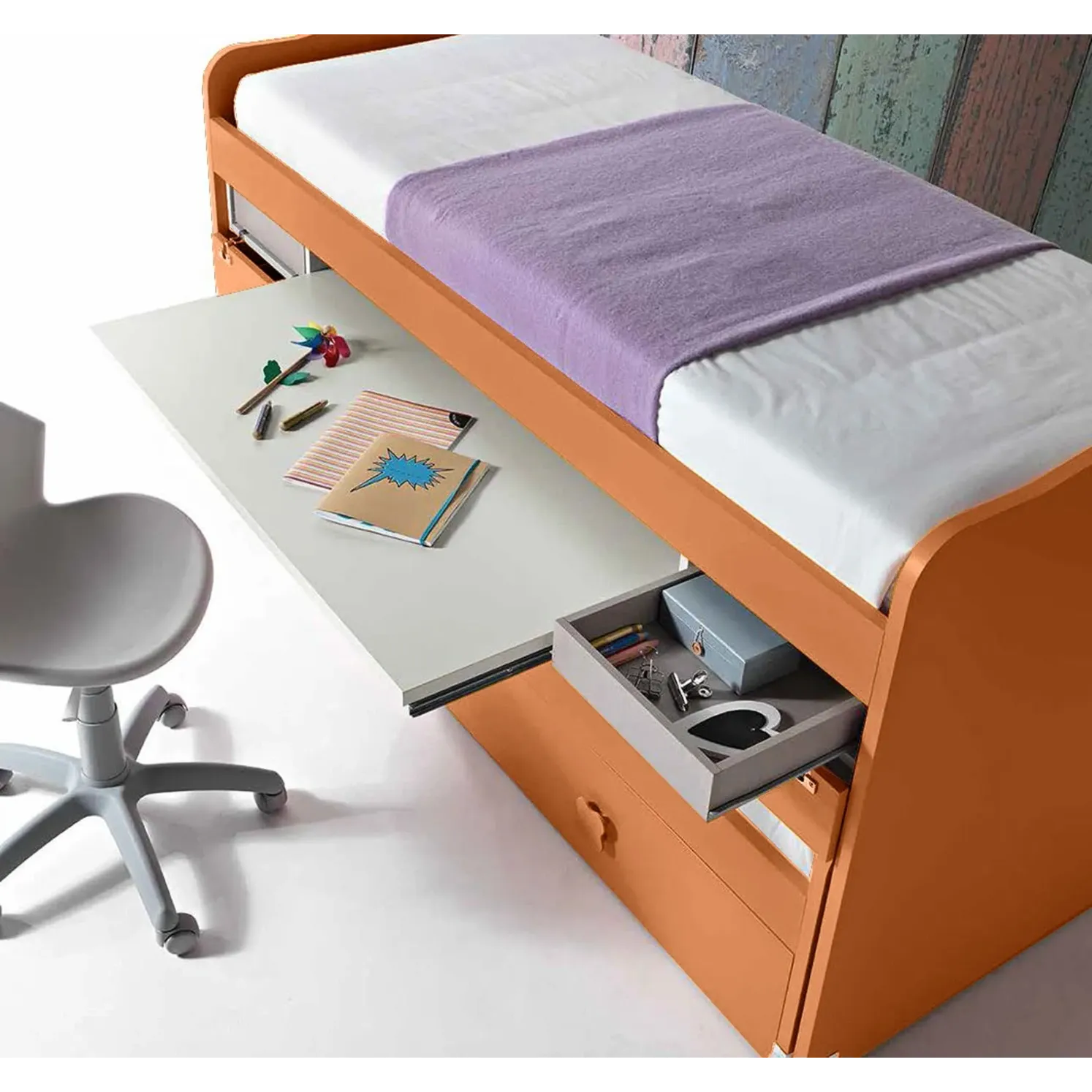 Il letto viene proposto nella finitura Terracotta, è possibile però personalizzarlo scegliendo tra un'ampia gamma di colori. Scrivania e cassetti sono disponibili solo nella finitura Nebbia.