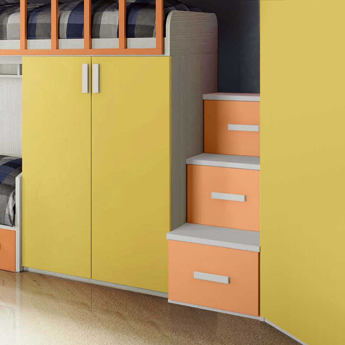 Capiente e funzionale il soppalco può ospitare fino a 3 ragazzi, grazie al divano letto con rete estraibile. Le finiture proposte sono Nuvola frassino pre struttura, Albicocca e Giallo per frontali, è possibile personalizzare la colorazione della cameretta tramite configuratore.