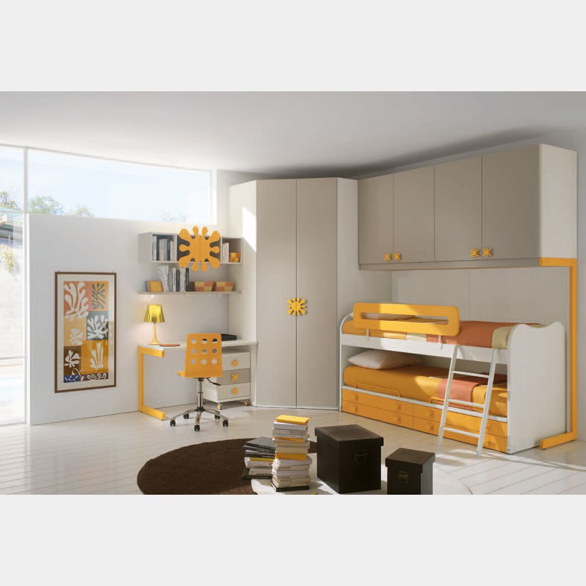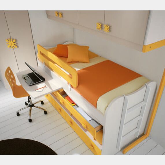 Letto a castello con scrivania estraibile e cassettoni in finitura Larice e Zafferano LACCATO