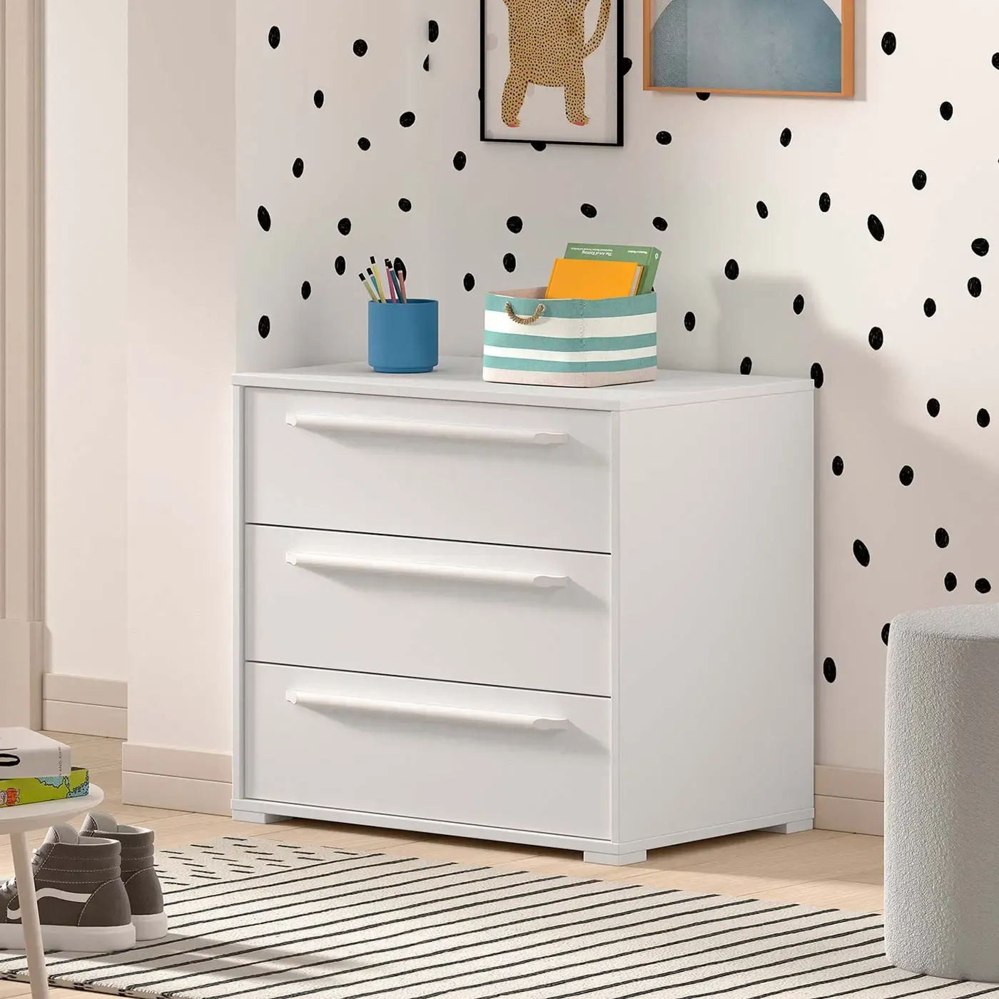 La scrivania estraibile offre un'ampia superficie, perfetta per fare i compiti o altre attività creative, mentre lo spazio sottostante viene utilizzato come spazio di archiviazione aggiuntivo con il posizionamento di 2 cassettiere a 3 cassetti. Queste unità offrono ampio spazio per riporre libri, materiale scolastico, giocattoli,...