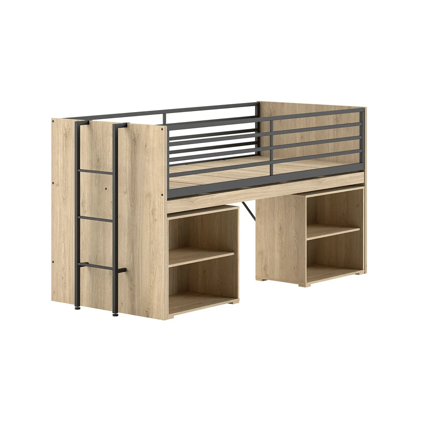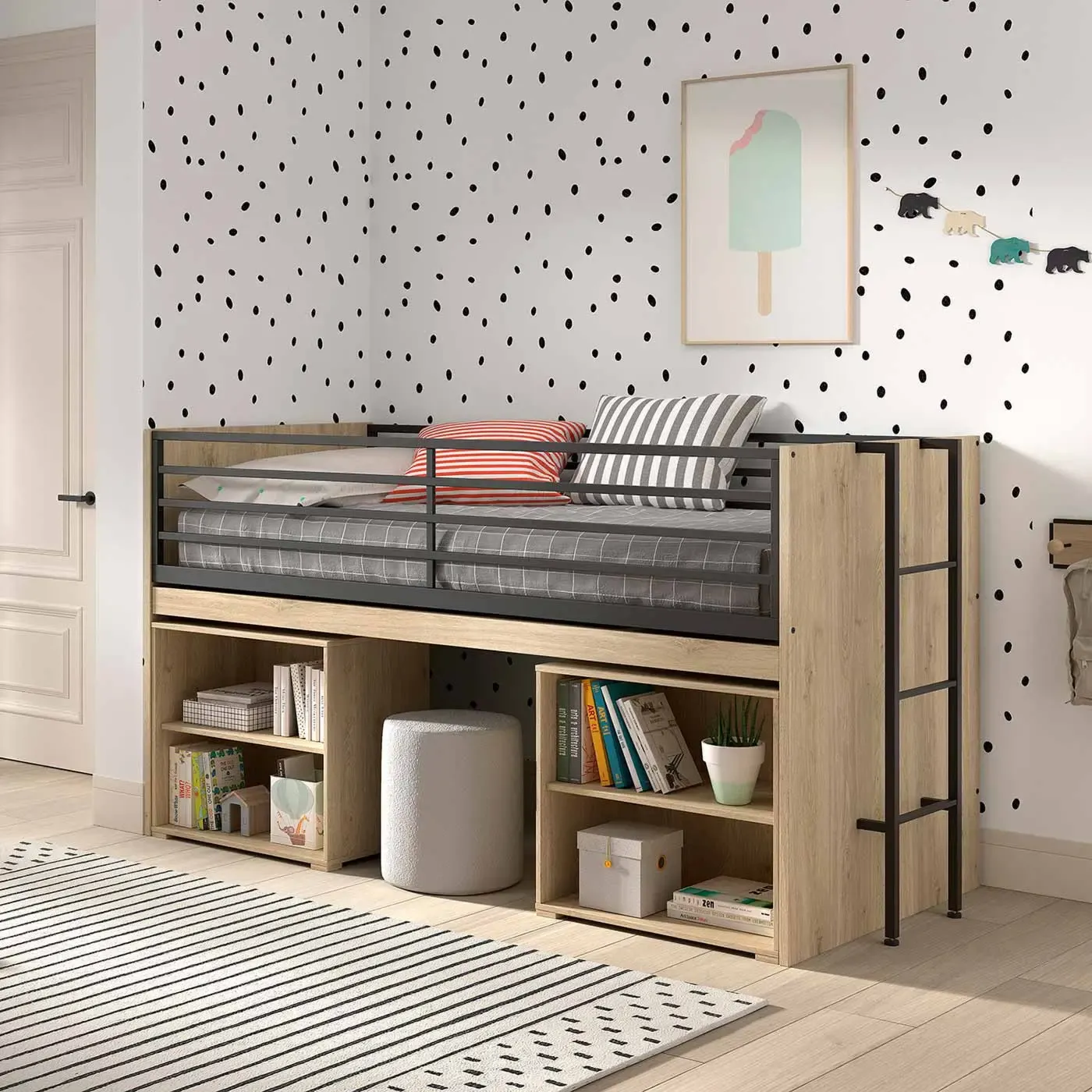 Questo letto a mezza altezza in legno trucciolare in finitura Rovere di tendenza con accenti in Metallo nero ha un aspetto contemporaneo. Il letto è una soluzione intelligente ed elegante per chiunque cerchi arredi salvaspazio, oltre che per dormire. È stato progettato con attenzione ai dettagli e alla funzionalità. Esso è dotato di una sponda di sicurezza e di una robusta scala che può essere fissata sia sul lato sinistro che destro.