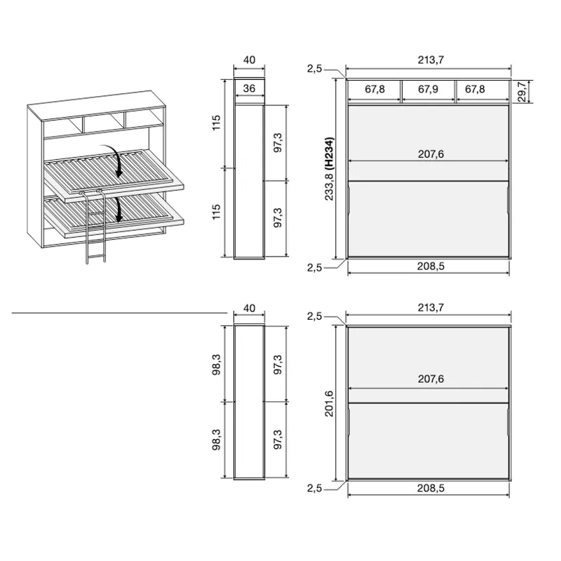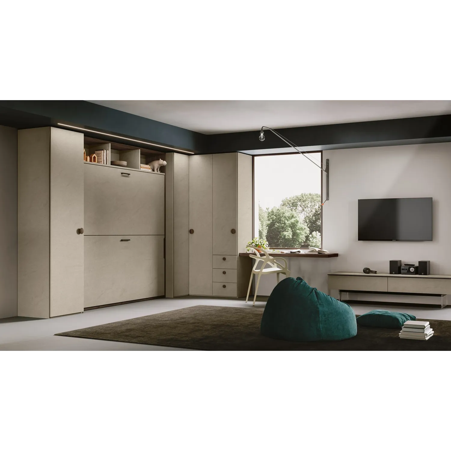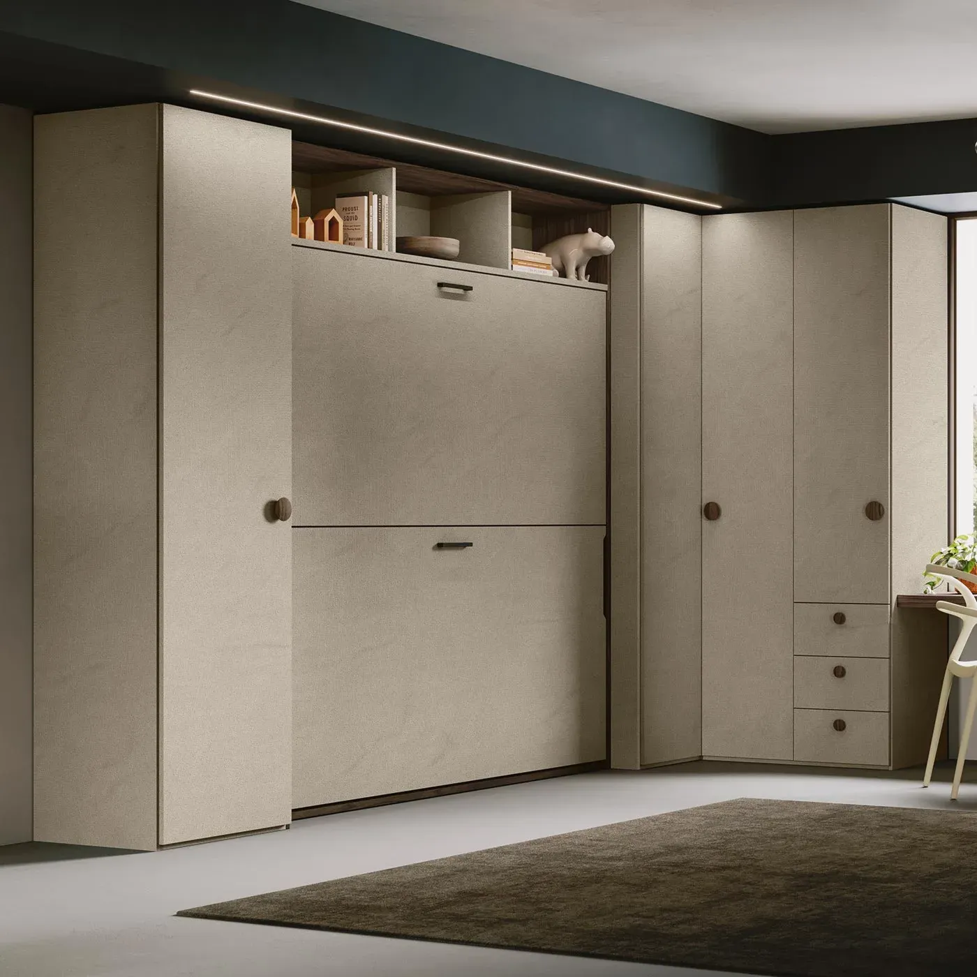 Letto a scomparsa a castello con armadiatura, Noce moro e Argilla