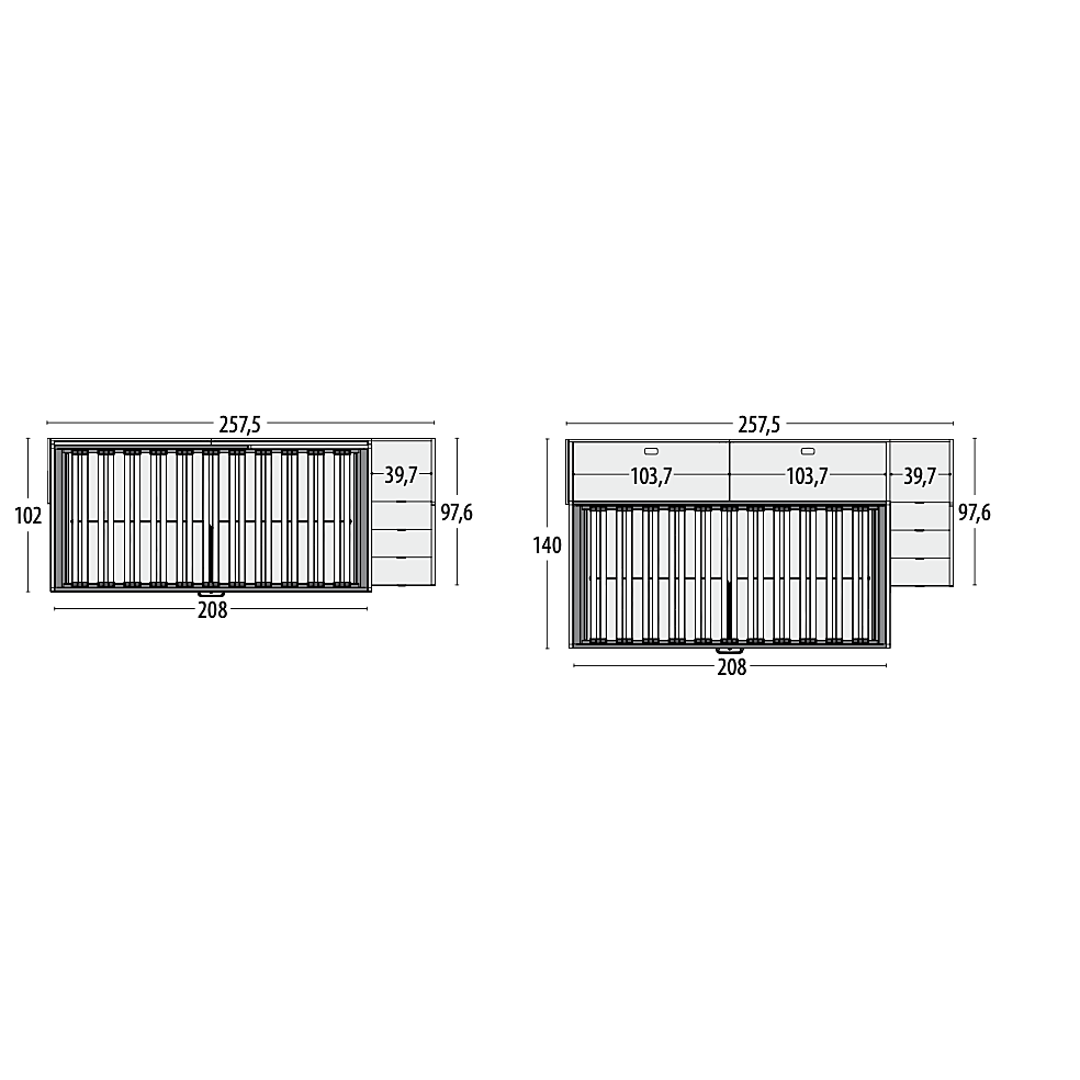 Scaletta e passerella sono dotati di cassetti contenitori per riporre giochi e oggetti vari. Le 4 ante battenti dell'armadio sono dotate di 2 tubi appendiabiti, cassettiera e ripiani sono optional.
