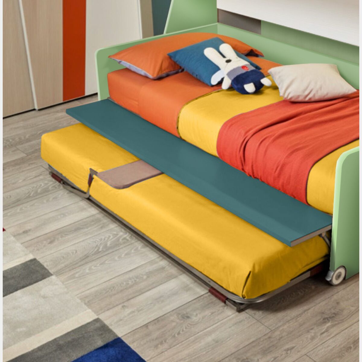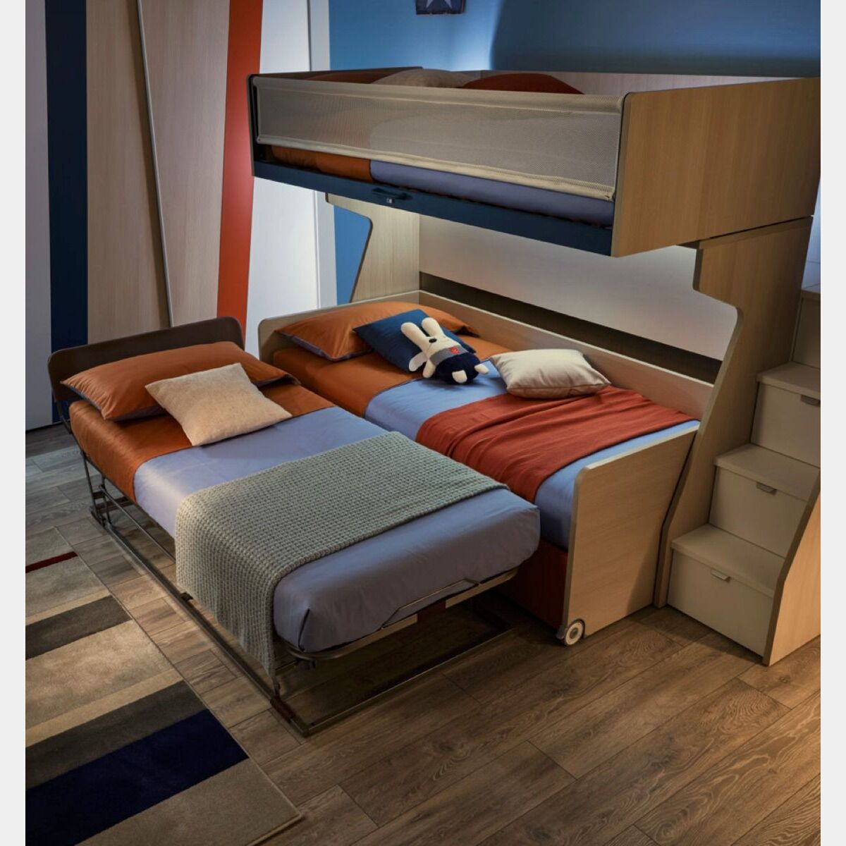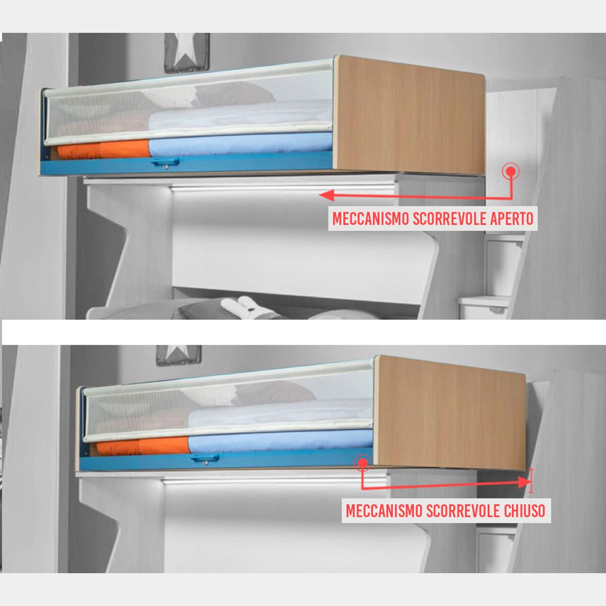 Un sistema pratico e intelligente che consente di predisporre i letti in modo semplice e veloce. Il letto superiore si sposta sul pianale agendo sulla maniglia frontale: la notte si apre e scorre verso il centro della stanza e rende accessibile il passaggio alla scaletta laterale, mentre di giorno si chiude occupando il minimo ingombro.