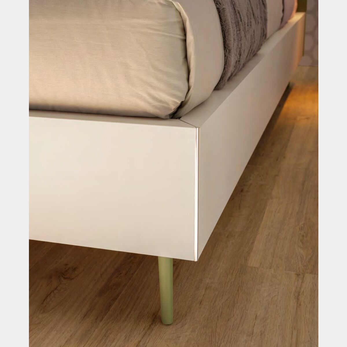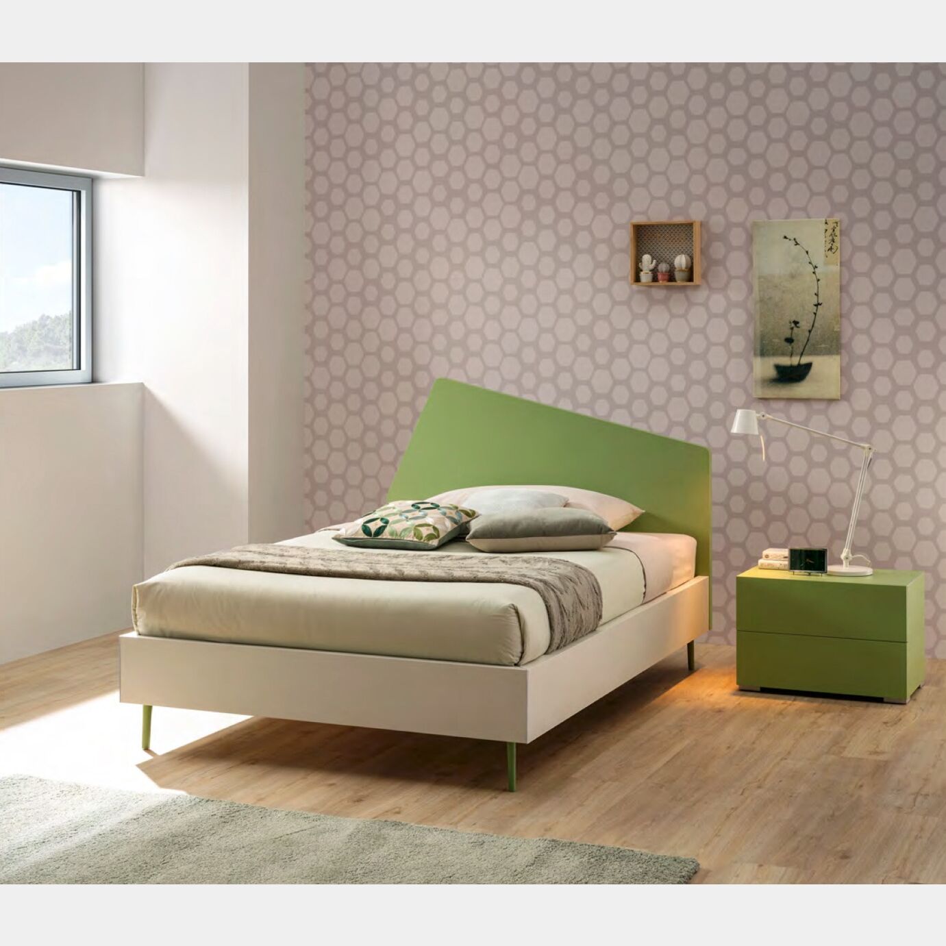 Il colore Flora laccato della testata e dei supporti si coordina in modo perfetto al laminato Quarzo scelto per il giroletto. Un nido moderno e accogliente dove ritirarsi con piacere.